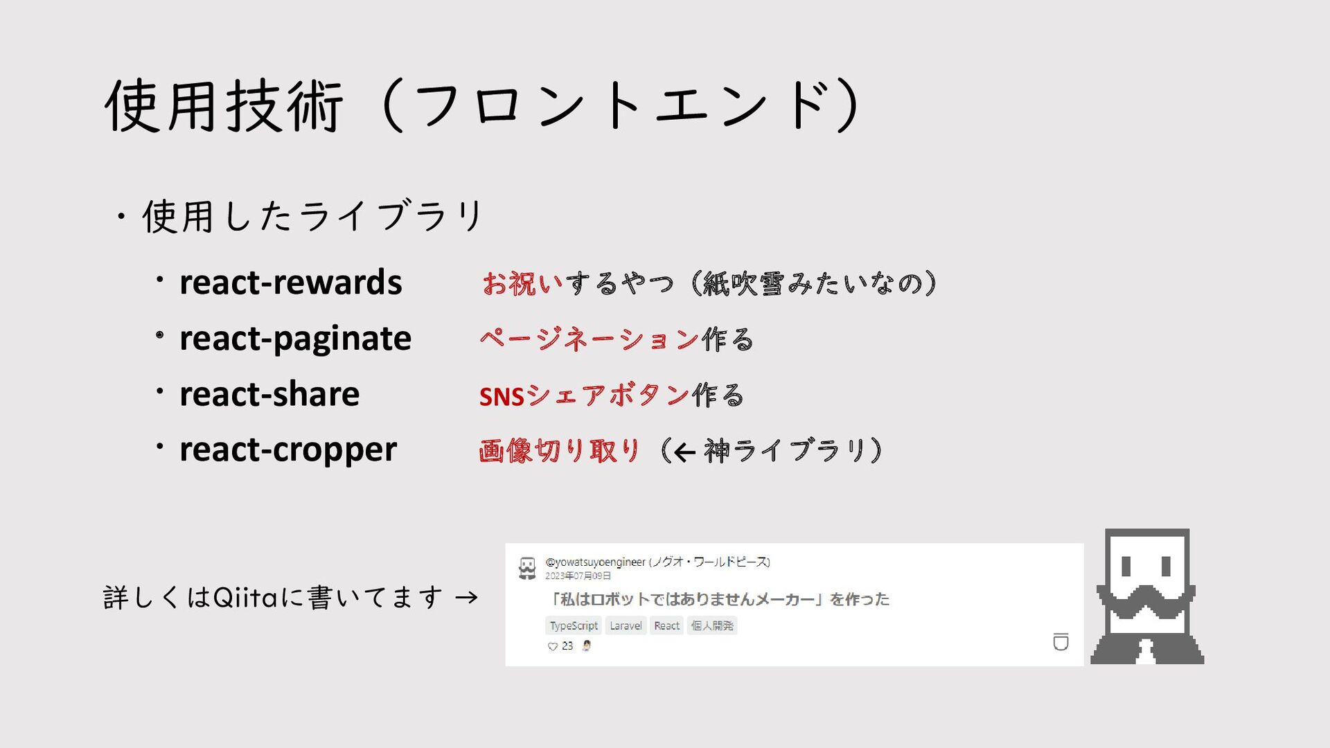 使用技術(フロントエンド) ・使用したライブラリ ・react-rewards お祝いするやつ(紙吹雪みたいなの) ・react-paginate ページネーション作る ・react-share SNSシェアボタン作る ・react-cropper 画像切り取り(←