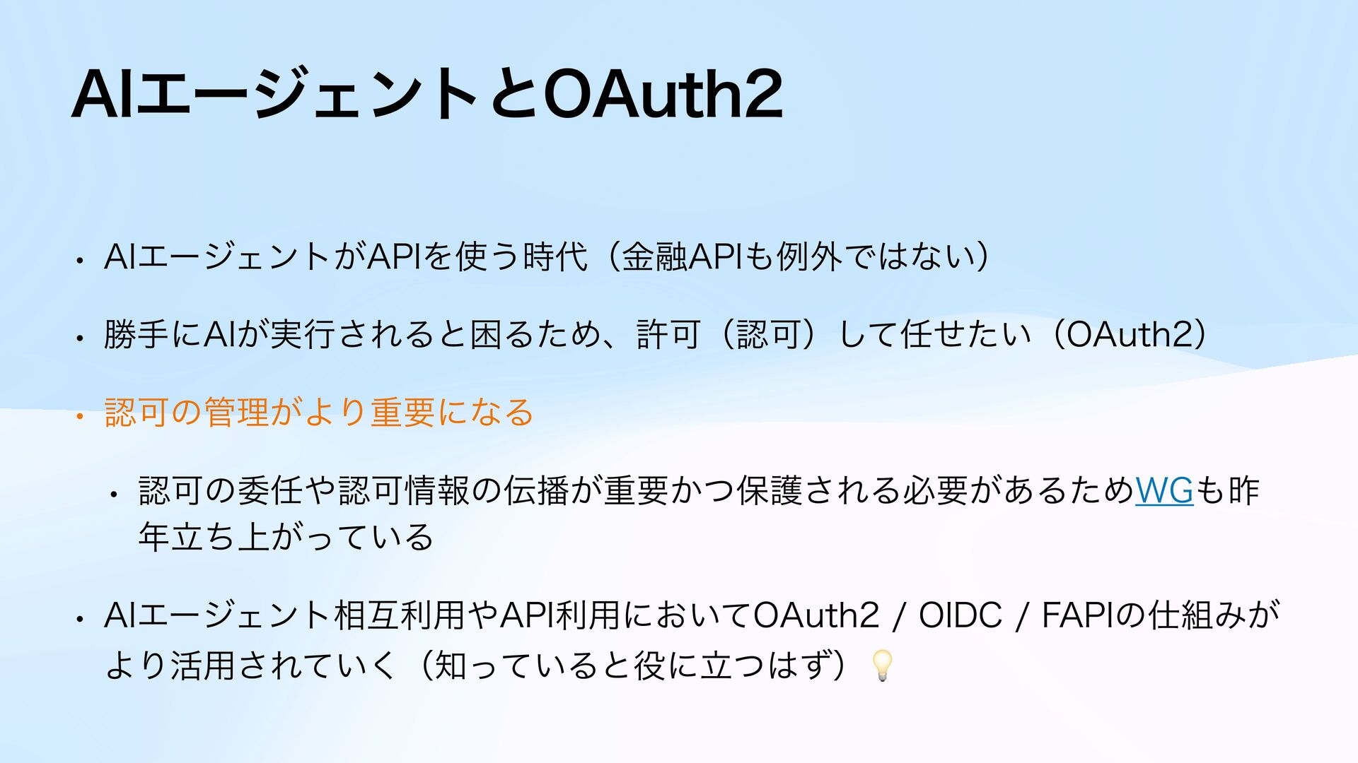 "*ΤʔδΣϯτͱ0"VUI w "*ΤʔδΣϯτ͕"1*Λ͏࣌ʢۚ༥"1*ྫ֎Ͱͳ͍ʣ w উखʹ"*͕࣮ߦ͞ΕΔͱࠔΔͨΊɺڐՄʢೝՄʣ͍ͯͤͨ͠ʢ0"VUIʣ w ೝՄͷཧ͕ΑΓॏཁʹͳΔ w ೝՄͷҕೝՄใͷ͕ॏཁ͔ͭอޢ͞ΕΔඞཁ͕͋ΔͨΊ8(ࡢ ্ཱ͕͍ͪͬͯΔ