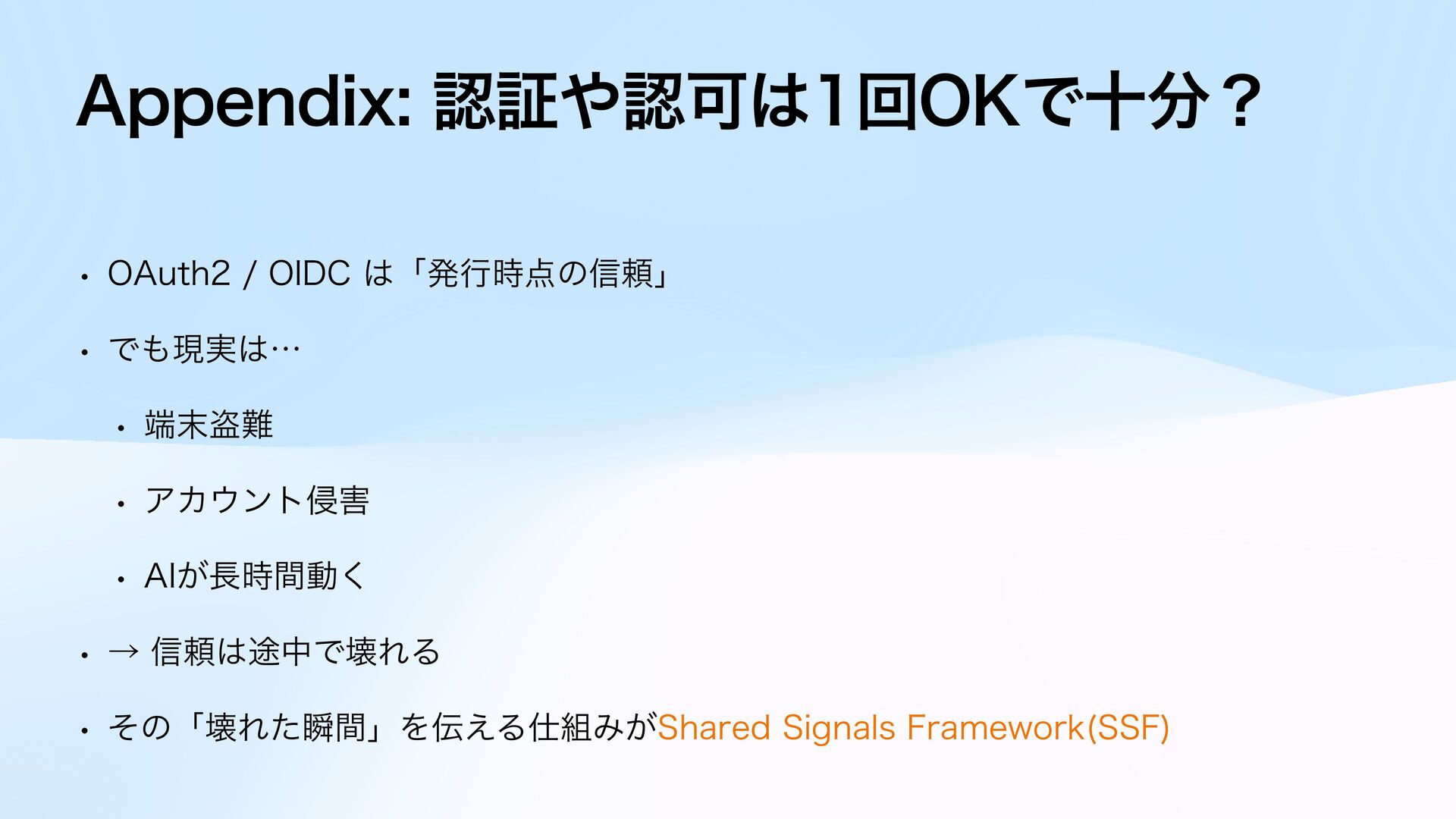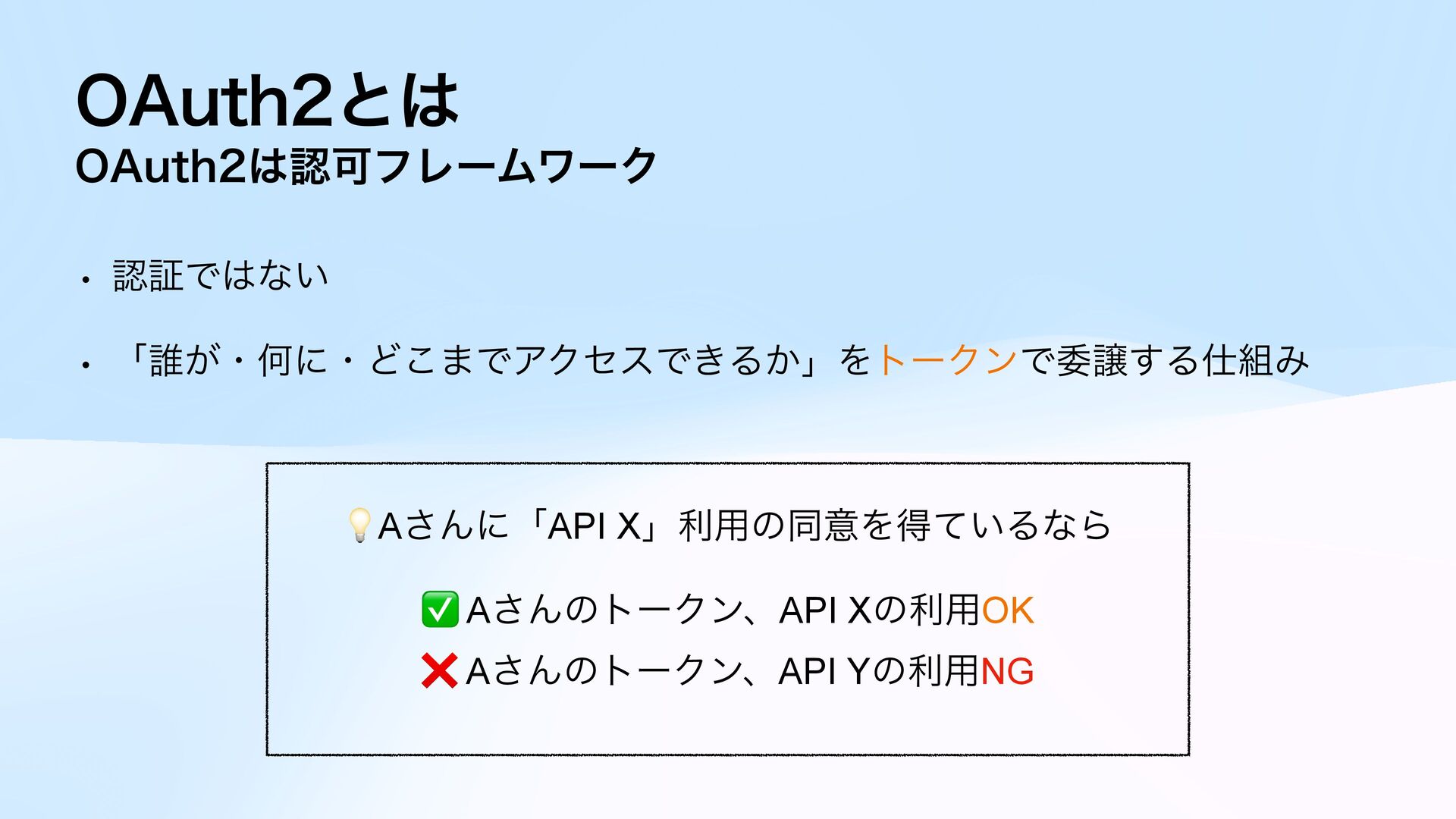 0"VUIͱ 0"VUIೝՄϑϨʔϜϫʔΫ w ೝূͰͳ͍ w ʮ୭͕ɾԿʹɾͲ͜·ͰΞΫηεͰ͖Δ͔ʯΛτʔΫϯͰҕৡ͢ΔΈ 💡A͞ΜʹʮAPI Xʯར༻ͷಉҙΛಘ͍ͯΔͳΒ ✅ A͞ΜͷτʔΫϯɺAPI