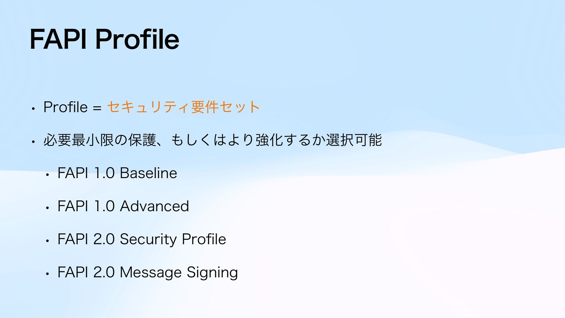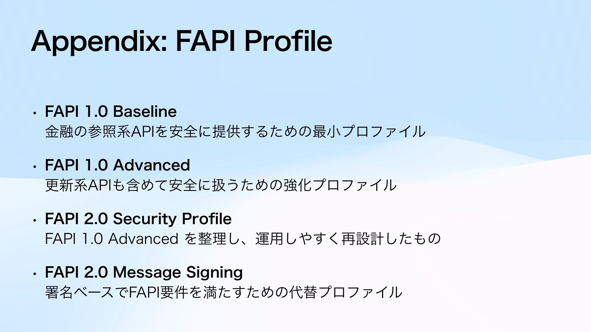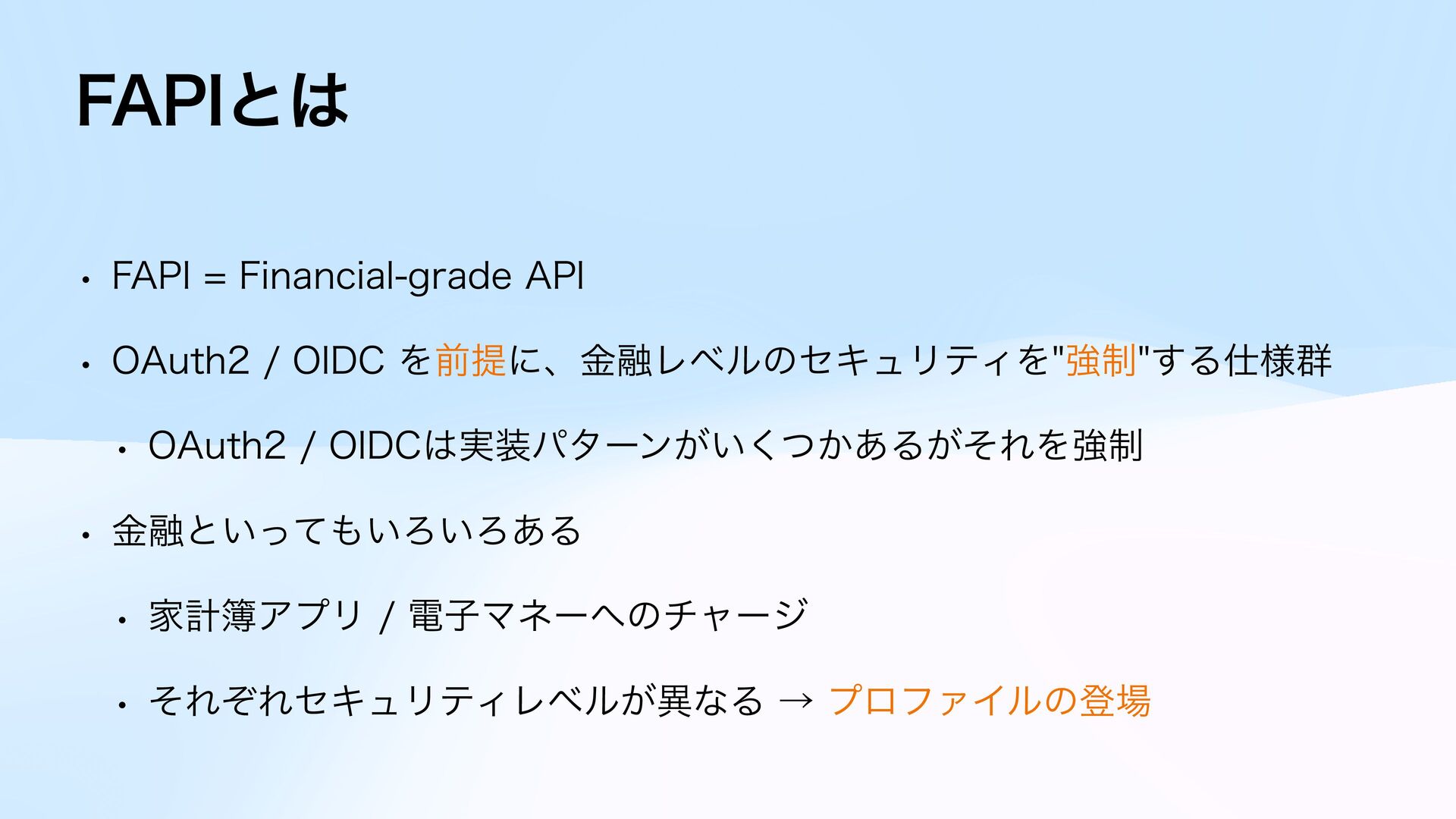 '"1*ͱ w '"1*'JOBODJBMHSBEF"1* w 0"VUI0*%$Λલఏʹɺۚ༥ϨϕϧͷηΩϡϦςΟΛڧ੍͢Δ༷܈ w 0"VUI0*%$࣮ύλʔϯ͕͍͔ͭ͋͘Δ͕ͦΕΛڧ੍ w ۚ༥ͱ͍͍ͬͯΖ͍Ζ͋Δ w