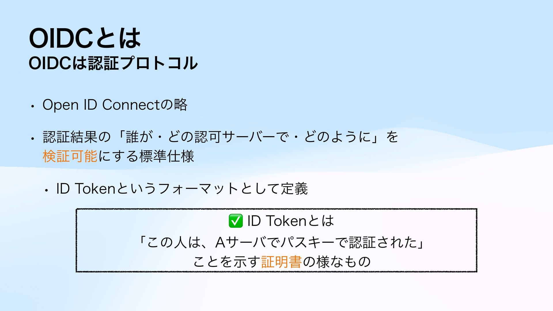 0*%$ͱ 0*%$ೝূϓϩτίϧ w 0QFO*%$POOFDUͷུ w ೝূ݁Ռͷʮ୭͕ɾͲͷೝՄαʔόʔͰɾͲͷΑ͏ʹʯΛ ݕূՄೳʹ͢Δඪ४༷ w *%5PLFOͱ͍͏ϑΥʔϚοτͱͯ͠ఆٛ ✅*%5PLFOͱ