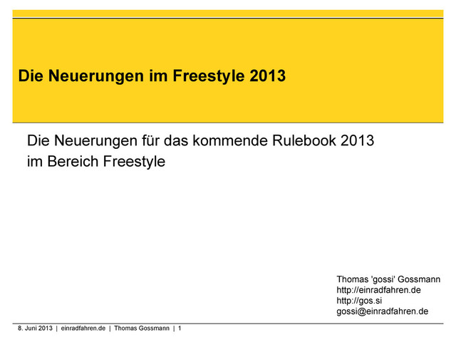 2. Requisiten vs. Dekoration Requisiten Dekorationen Definition * Der Fahrer zeigt im Umgang mit dem Requisit eine technische Fähigkeit Dekorationen erfordern im Umgang keine technische Fähigkeit Beispiele Keulen, Bälle, Band, Regenschirm Personen, Kulissen Einsatz Sportliche Fähigkeit zeigen Zusätzliche Erklärung des Themas Bewertung + Positive Zusatzbewertung - Abzug, wenn Einsatz verfehlt Unicon Verboten, was ein Fahrer nicht selbst aufs Kürfeld tragen kann * Die genauen Definition finden sich im neuen Rulebook