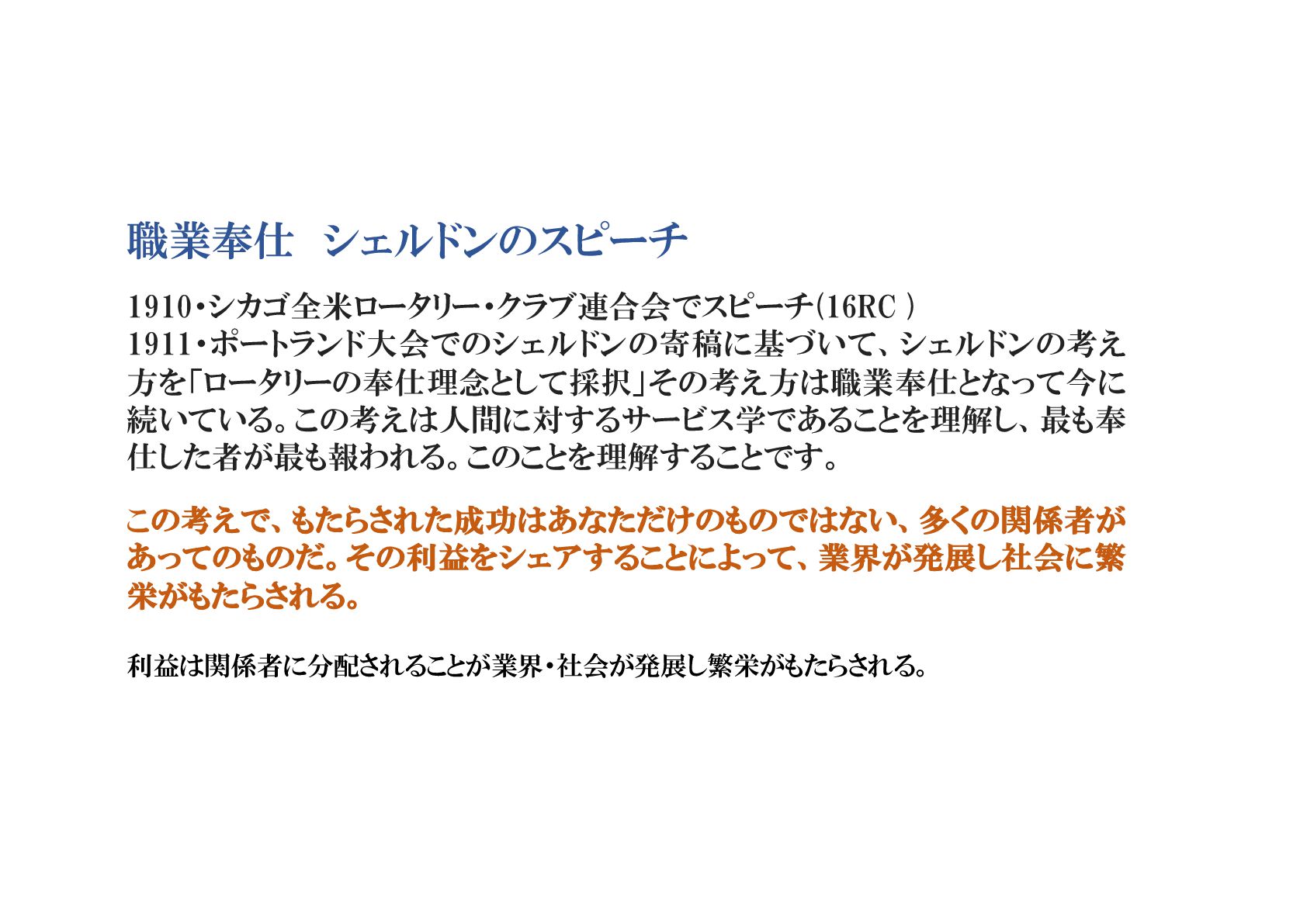 職業奉仕 シェルドンのスピーチ 1910・シカゴ全米ロータリー・クラブ連合会でスピーチ(16RC ) 1911・ポートランド大会でのシェルドンの寄稿に基づいて、シェルドンの考え 方を「ロータリーの奉仕理念として採択」その考え方は職業奉仕となって今に 続いている。この考えは人間に対するサービス学であることを理解し、最も奉 仕した者が最も報われる。このことを理解することです。 この考えで、もたらされた成功はあなただけのものではない、多くの関係者が あってのものだ。その利益をシェアすることによって、業界が発展し社会に繁