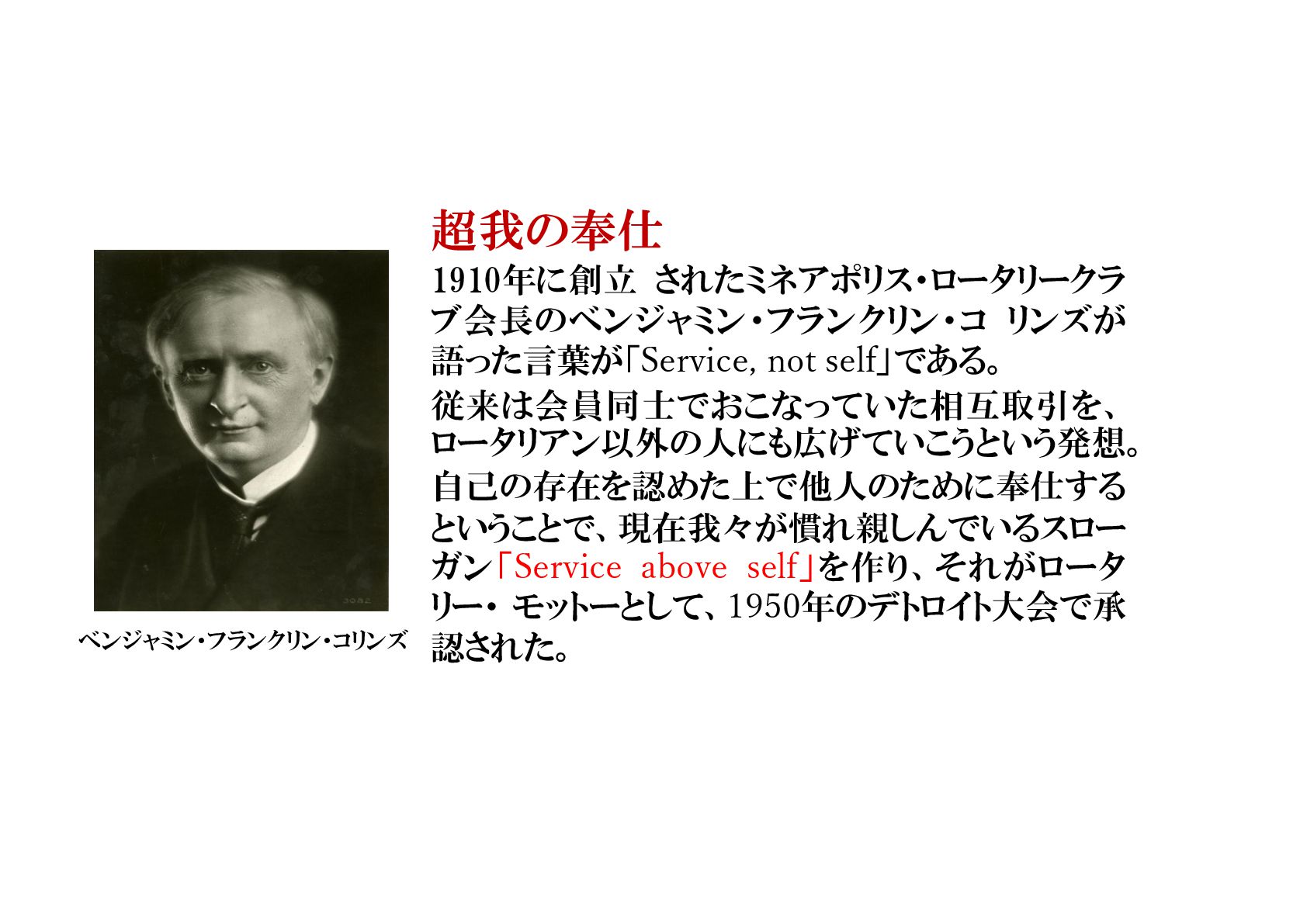 超我の奉仕 1910年に創立 されたミネアポリス・ロータリークラ ブ会長のベンジャミン・フランクリン・コ リンズが 語った言葉が「Service, not self」である。 従来は会員同士でおこなっていた相互取引を、 ロータリアン以外の人にも広げていこうという発想。