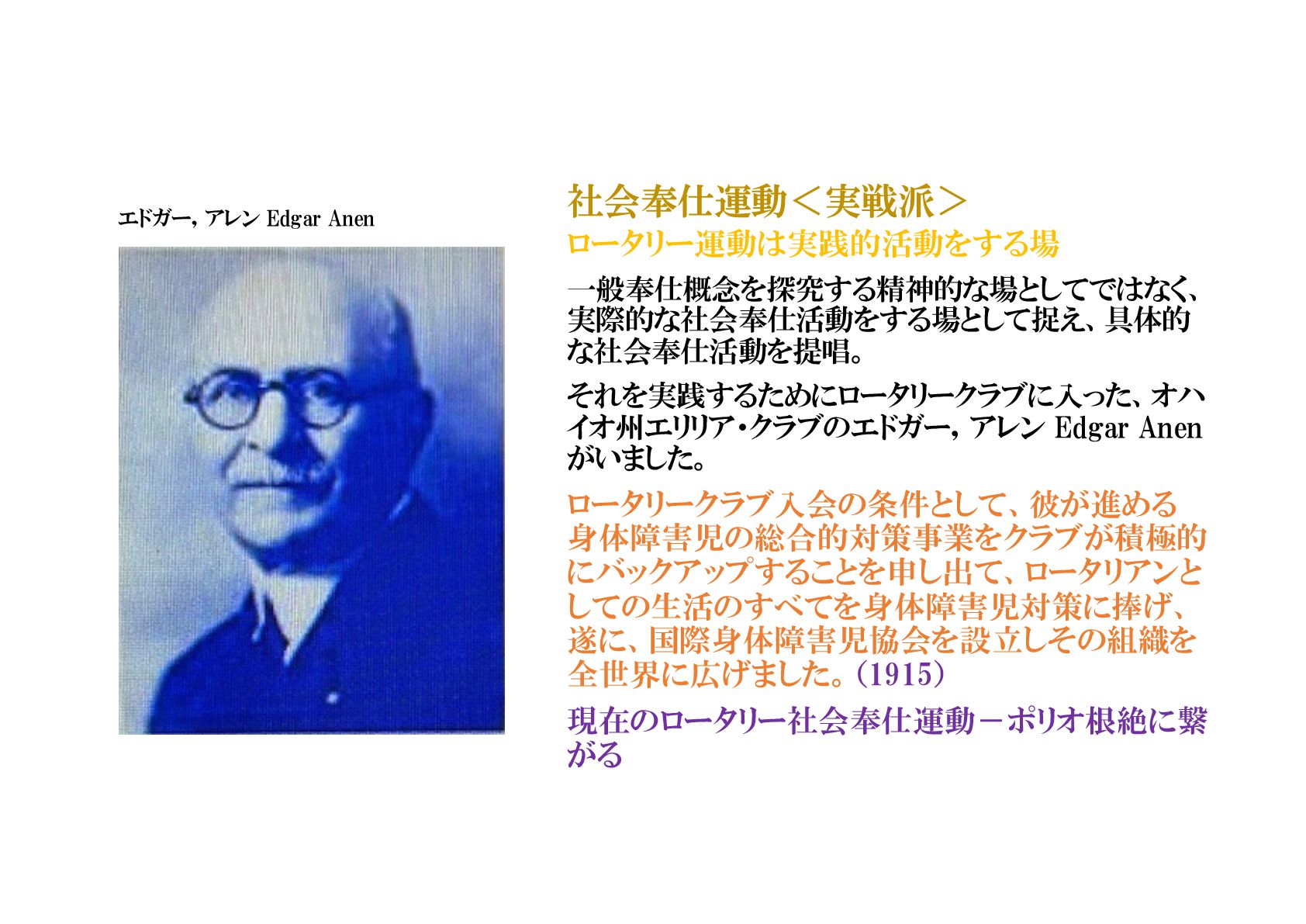 Edgar Anen がいました。 ロータリークラブ入会の条件として、彼が進める 身体障害児の総合的対策事業をクラブが積極的 にバックアップすることを申し出て、ロータリアンと しての生活のすべてを身体障害児対策に捧げ、 遂に、国際身体障害児協会を設立しその組織を 全世界に広げました。(1915) 現在のロータリー社会奉仕運動-ポリオ根絶に繋 がる
