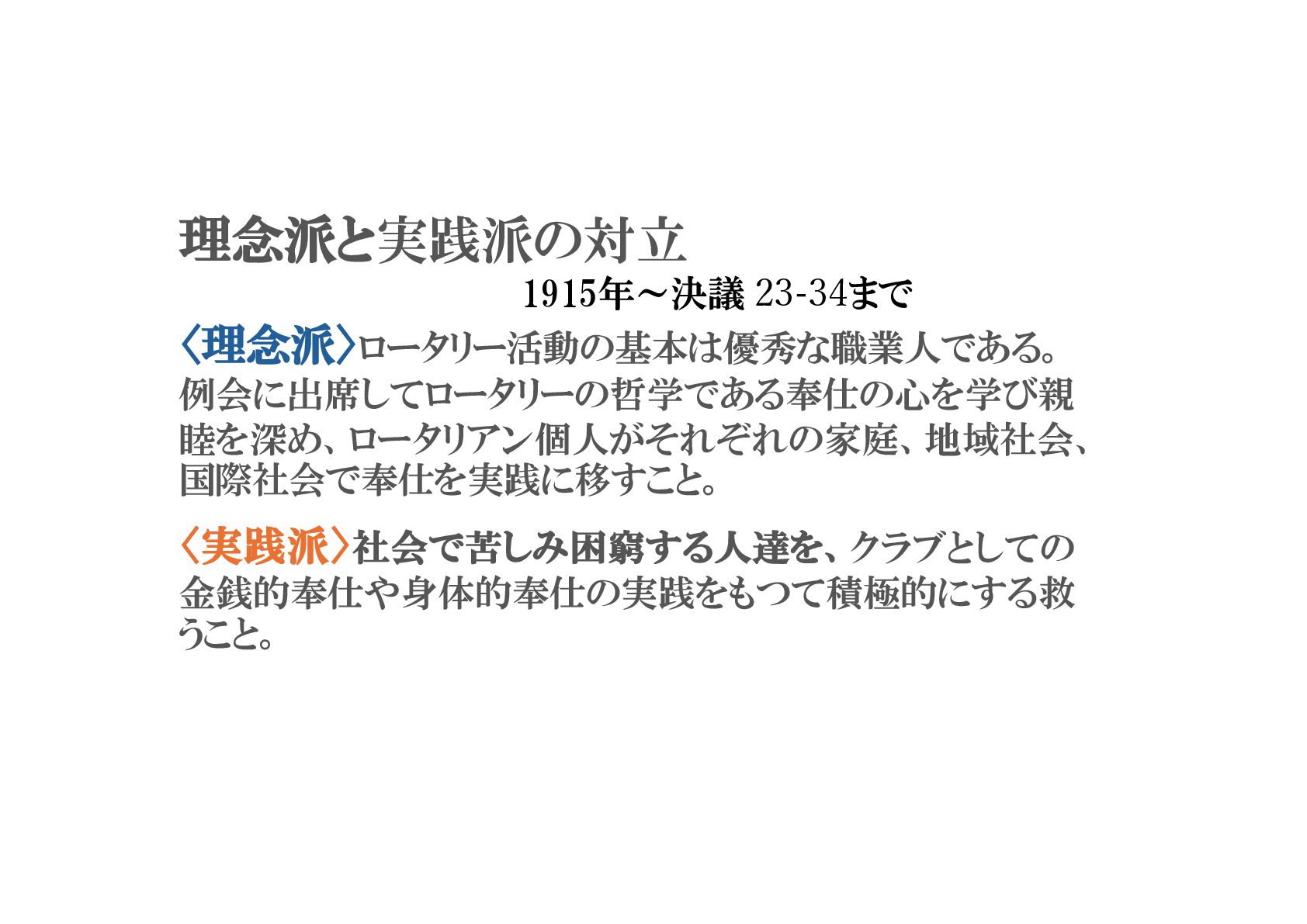 理念派と実践派の対立 1915年~決議 23-34まで 〈理念派〉ロータリー活動の基本は優秀な職業人である。 例会に出席してロータリーの哲学である奉仕の心を学び親 睦を深め、ロータリアン個人がそれぞれの家庭、地域社会、 国際社会で奉仕を実践に移すこと。 〈実践派〉社会で苦しみ困窮する人達を、クラブとしての 金銭的奉仕や身体的奉仕の実践をもつて積極的にする救 うこと。