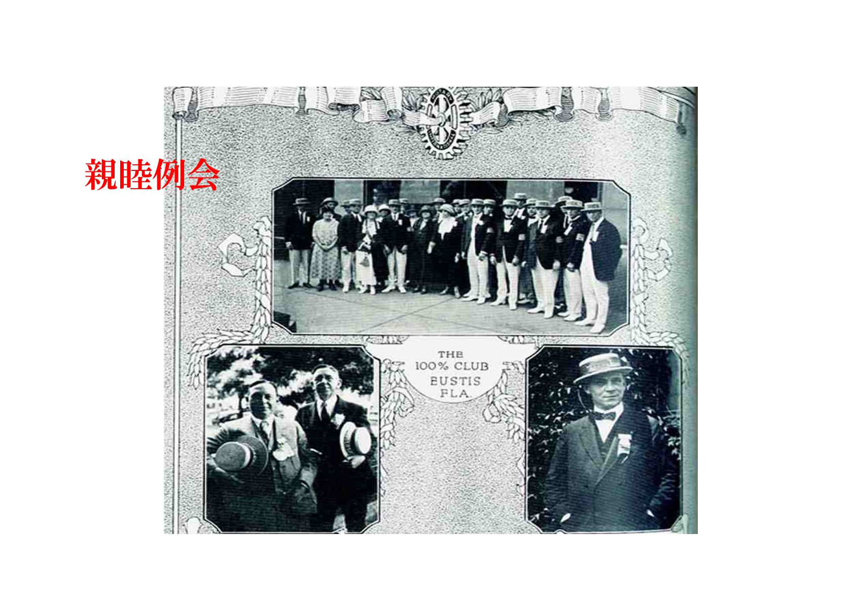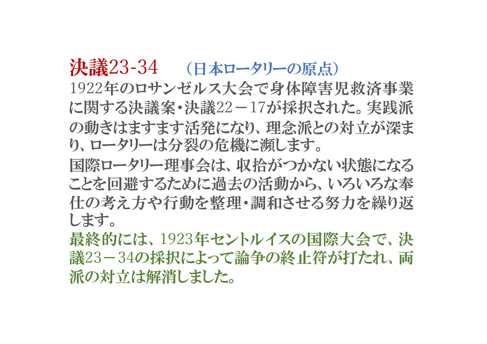 決議23-34 (日本ロータリーの原点) 1922年のロサンゼルス大会で身体障害児救済事業 に関する決議案・決議22-17が採択された。実践派 の動きはますます活発になり、理念派との対立が深ま り、ロータリーは分裂の危機に瀕します。 国際ロータリー理事会は、収拾がつかない状態になる ことを回避するために過去の活動から、いろいろな奉 仕の考え方や行動を整理・調和させる努力を繰り返 します。