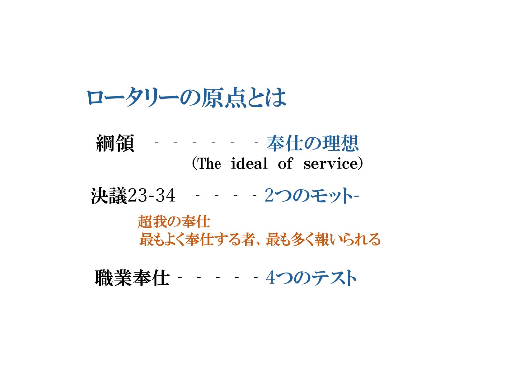 ロータリーの原点とは 綱領 ‐‐‐‐‐ ‐奉仕の理想 (The ideal of service) 決議23-34 ‐‐‐‐2つのモット-