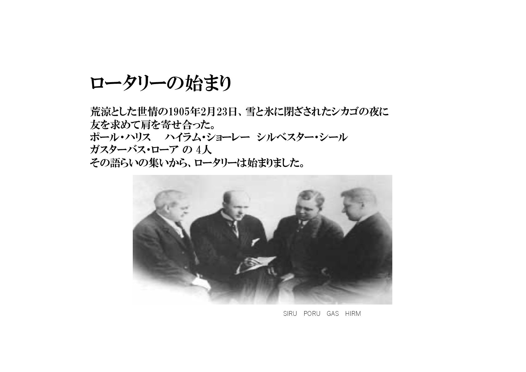ロータリーの始まり 荒涼とした世情の1905年2月23日、雪と氷に閉ざされたシカゴの夜に 友を求めて肩を寄せ合った。 ポール・ハリス ハイラム・ショーレー シルベスター・シール ガスターバス・ローア の 4人 その語らいの集いから、ロータリーは始まりました。