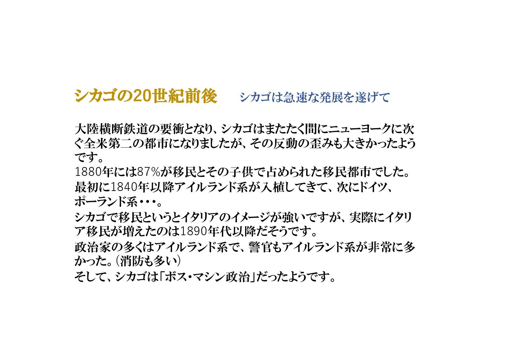 政治家の多くはアイルランド系で、警官もアイルランド系が非常に多 かった。(消防も多い) そして、シカゴは「ボス・マシン政治」だったようです。