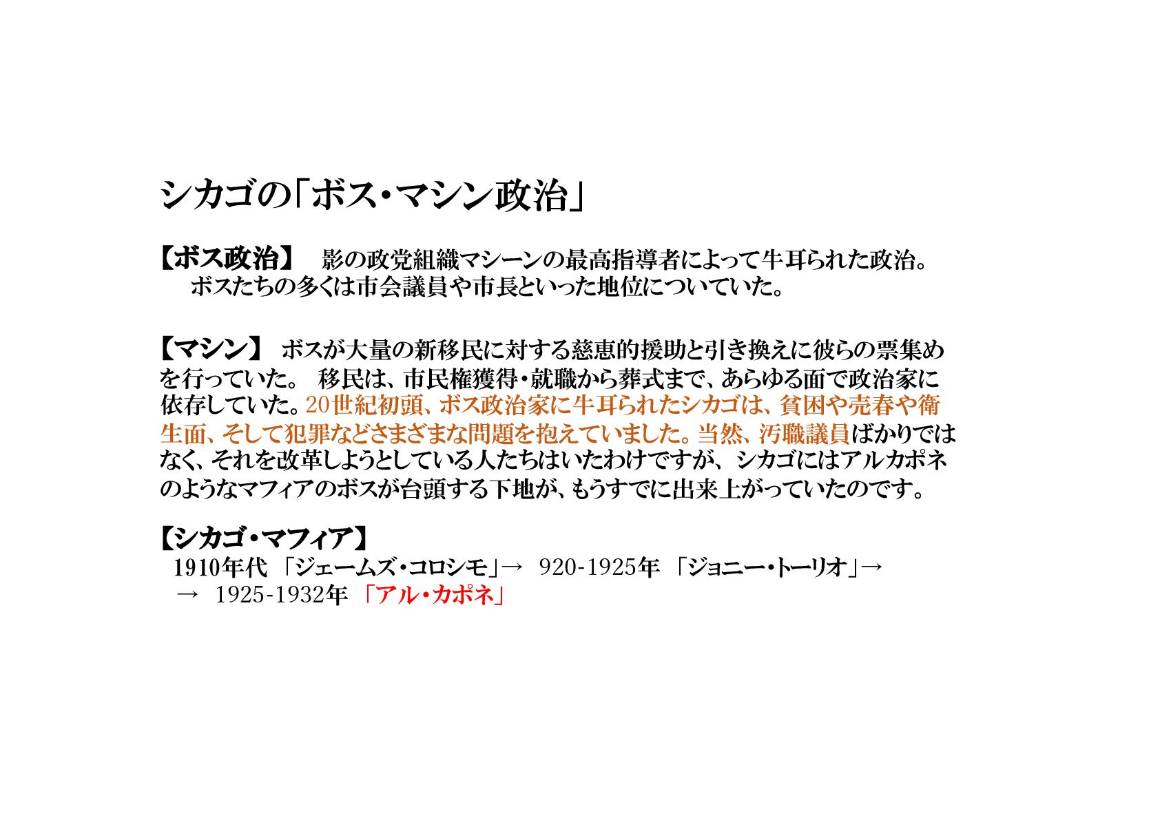 シカゴの「ボス・マシン政治」 【ボス政治】 影の政党組織マシーンの最高指導者によって牛耳られた政治。 ボスたちの多くは市会議員や市長といった地位についていた。 【マシン】 ボスが大量の新移民に対する慈恵的援助と引き換えに彼らの票集め を行っていた。 移民は、市民権獲得・就職から葬式まで、あらゆる面で政治家に 依存していた。20世紀初頭、ボス政治家に牛耳られたシカゴは、貧困や売春や衛 生面、そして犯罪などさまざまな問題を抱えていました。当然、汚職議員ばかりでは