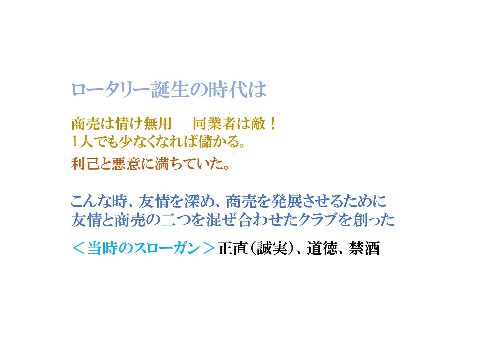 ロータリー誕生の時代は 商売は情け無用 同業者は敵! 1人でも少なくなれば儲かる。 . 利己と悪意に満ちていた。 こんな時、友情を深め、商売を発展させるために 友情と商売の二つを混ぜ合わせたクラブを創った <当時のスローガン>正直(誠実)、道徳、禁酒