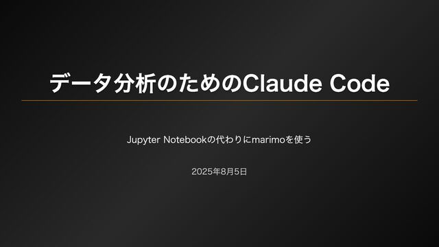 Claude Codeとmarimo(Python Notebooks)の組み合わせによるデータ分析ワークフローを提案するプレゼンテーション資料。Jupyter Notebookの課題(Git管理困難、再現性問題、開発者との溝)を指摘し、marimoの利点(.py形式でClaude Codeが直接実行可能、トークン消費削減、リアクティブ実行による再現性、豊富な標準機能)を解説。Claude Codeの自走力を最大限活用できる理由と実装デモを紹介している。