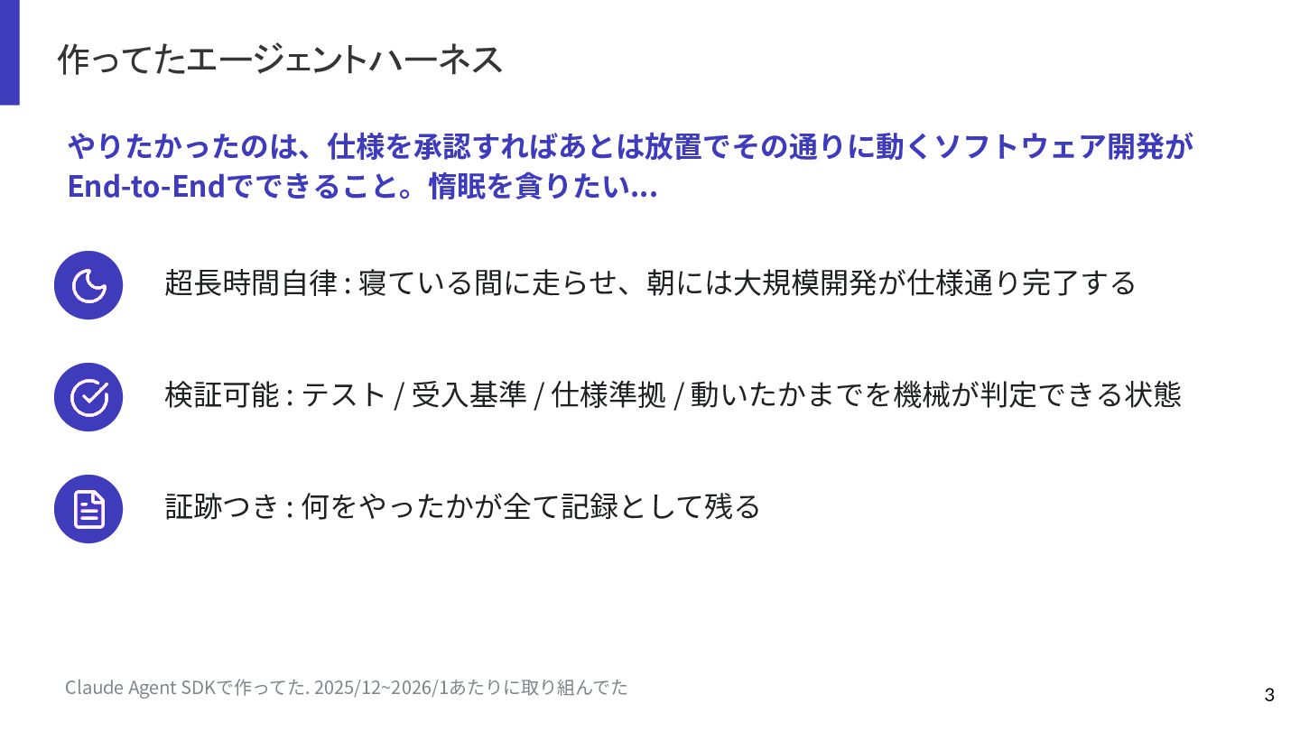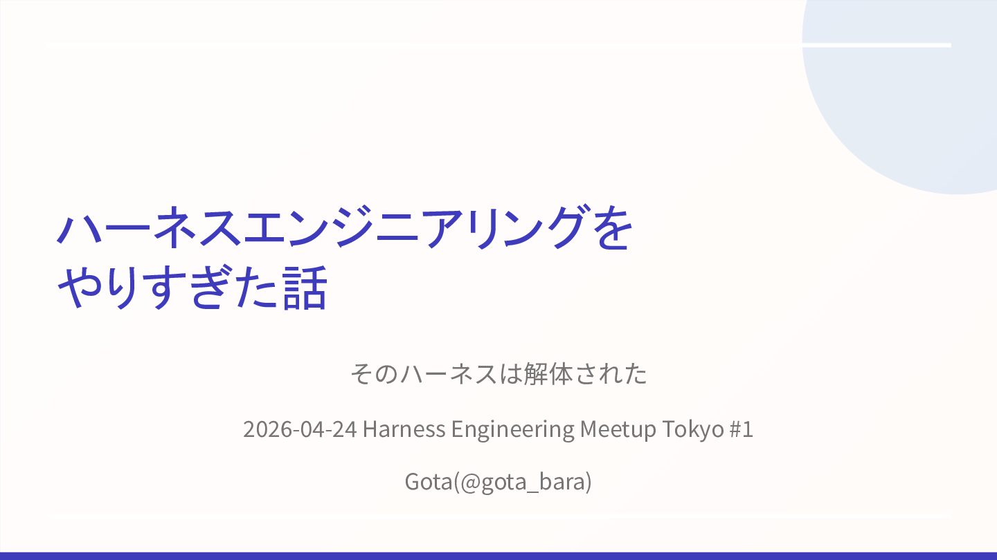 本発表では、AIエージェントによるソフトウェアの長時間自律開発を可能にする「エージェントハーネス」の構築と、その失敗の経緯を共有する。