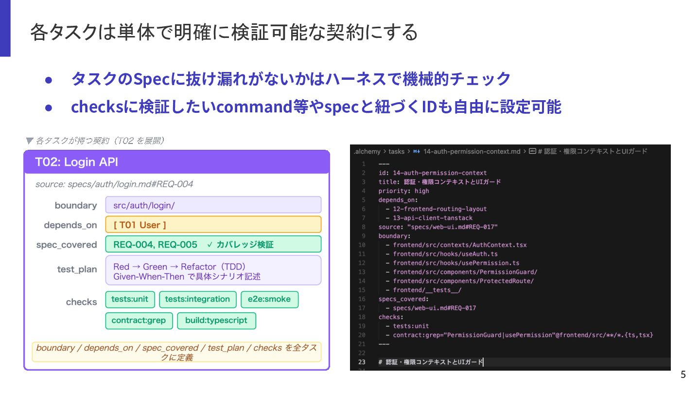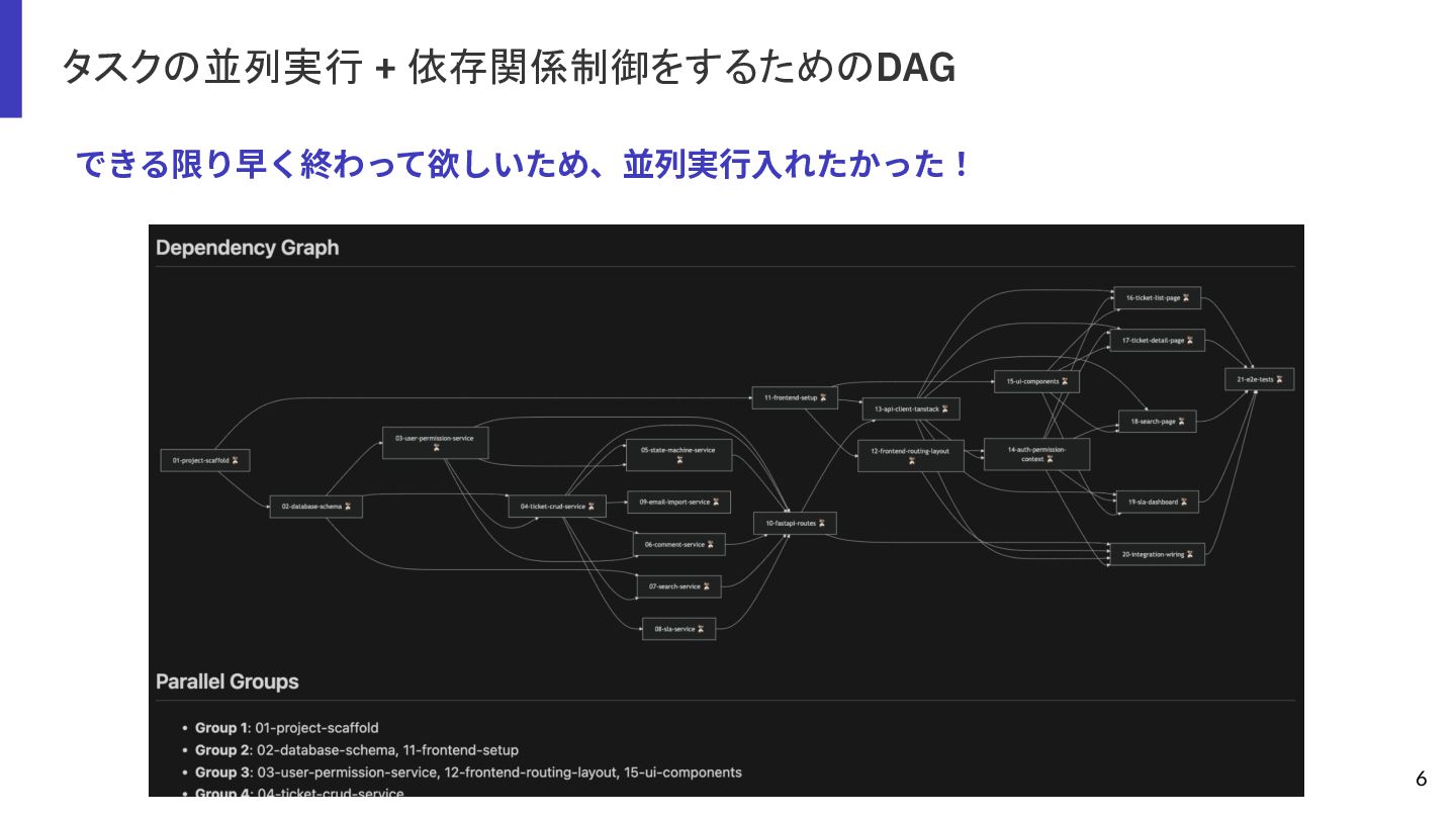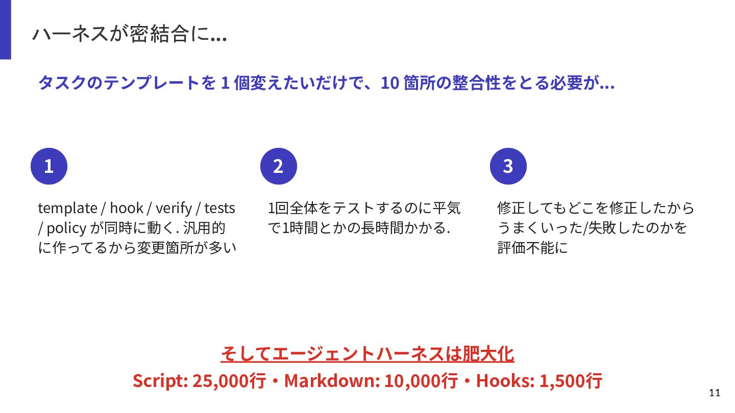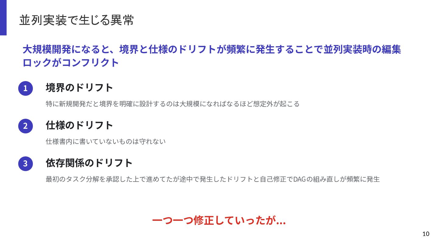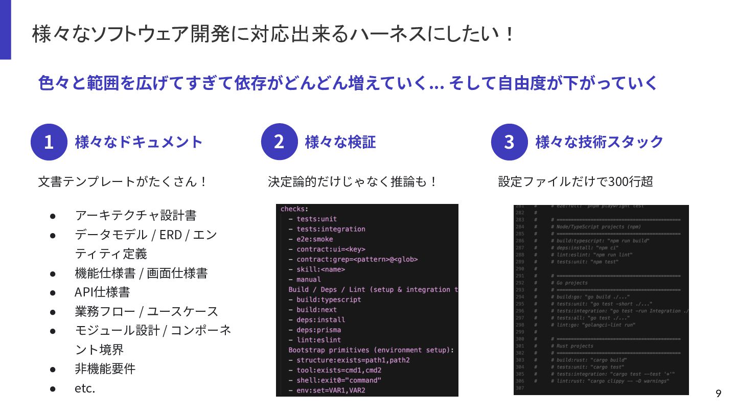 仕様承認後、放置で大規模開発を完了させることを目指し、タスク分解、並列実行、検証可能、証跡付きといった機能を盛り込んだ。最初、中規模開発に成功したことが最悪の成功体験となり、様々な開発に対応させるべく機能を拡張しすぎた。その結果、ハーネス自体が過度に密結合・肥大化し、修正や検証が困難になる制御不能な状態に陥り、最終的に解体した。
