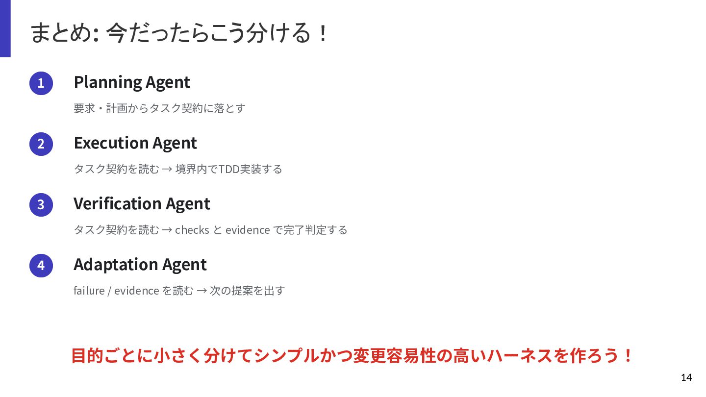 結論として、ハーネスを作成する際は目的ごとに小さく分割し、シンプルで変更容易性の高いハーネスを構築する必要がある