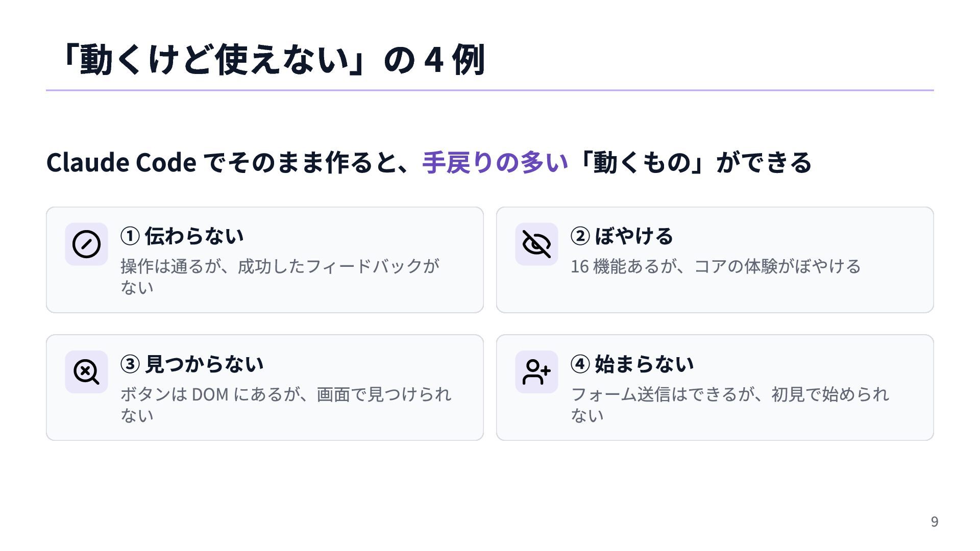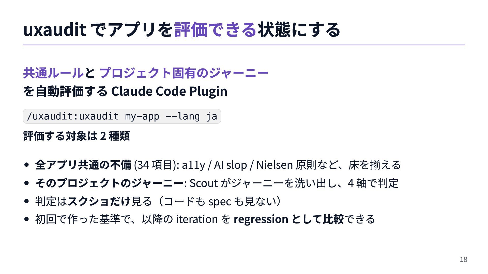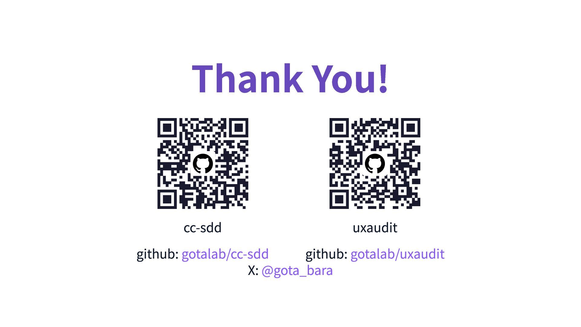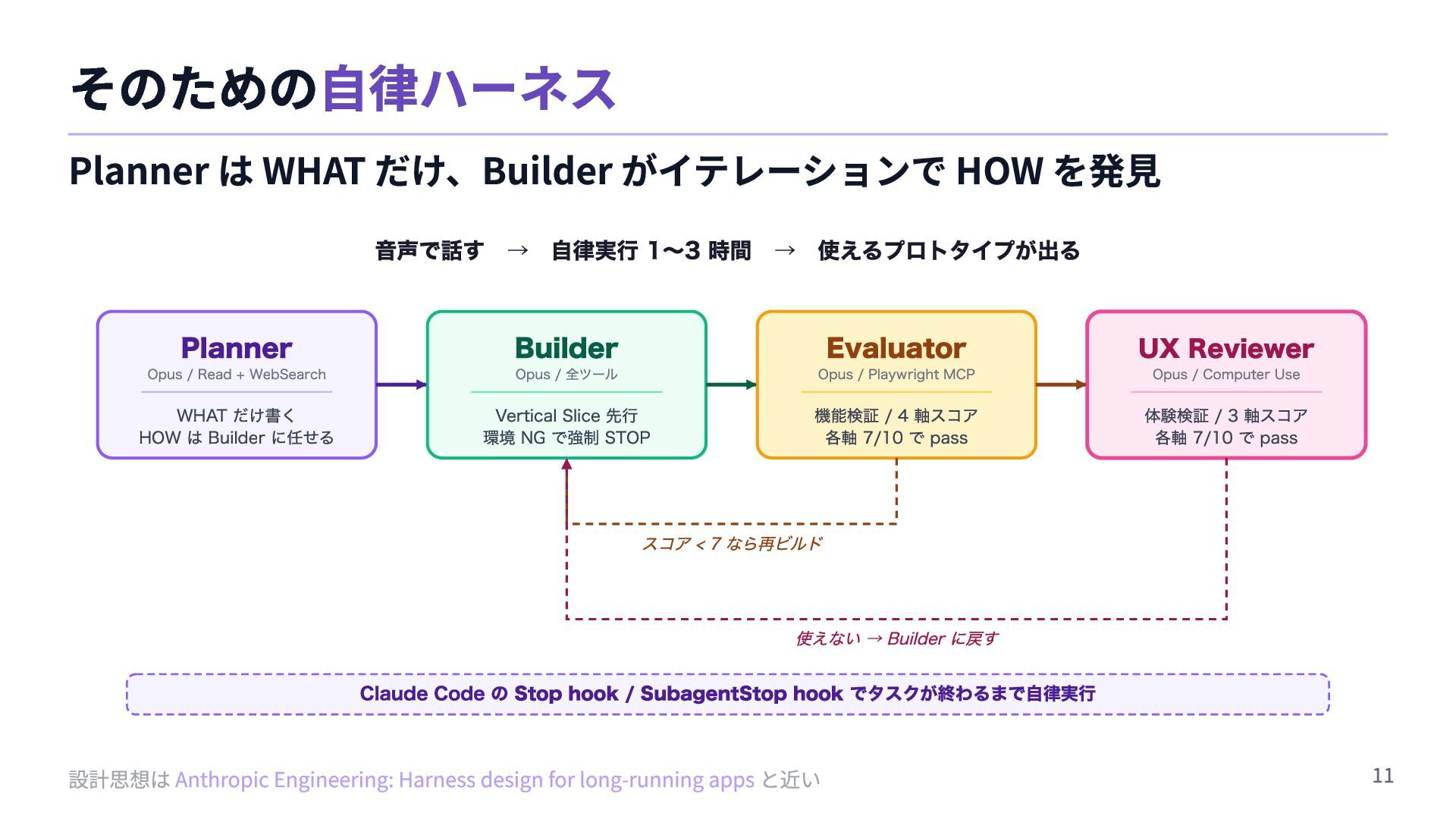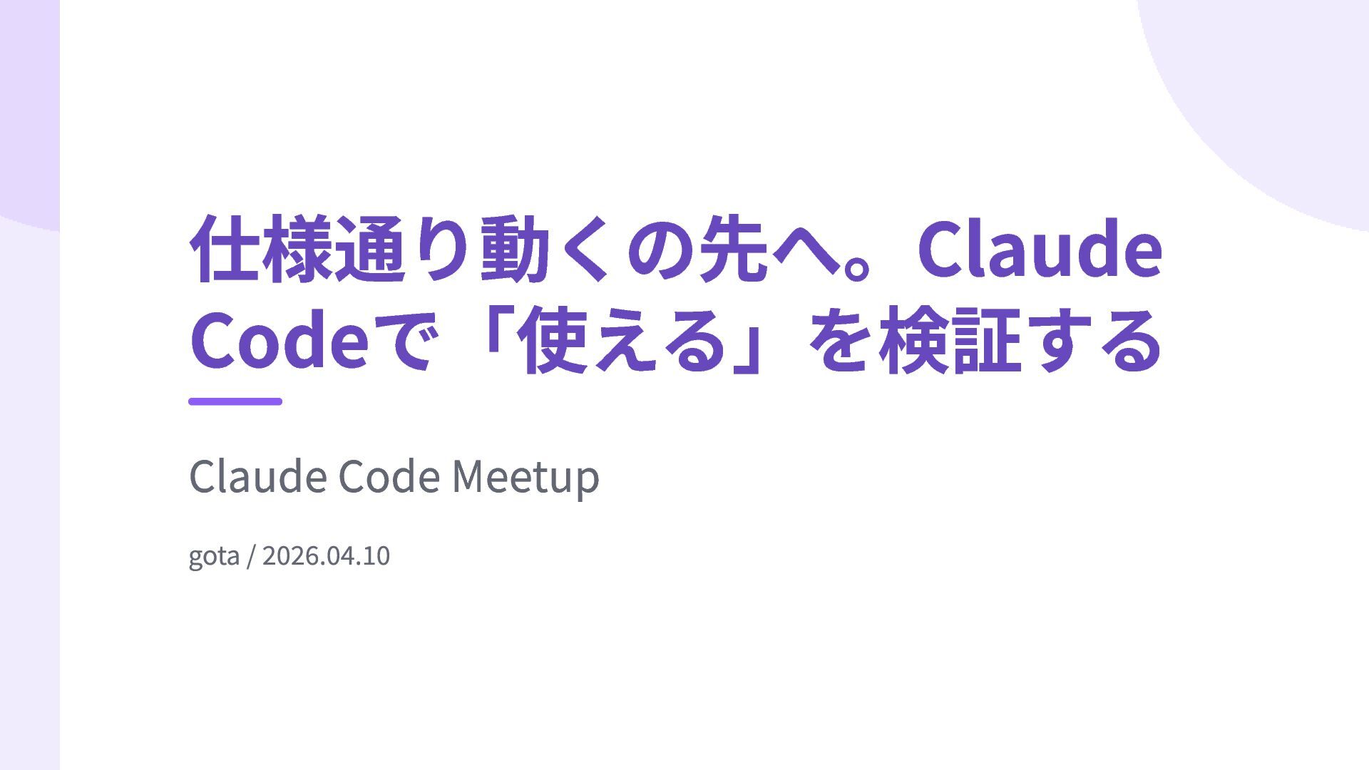 Claude Code Meetup Japan #4での発表資料。「仕様通りに動く」と「ユーザーが使える」の間にあるギャップを、Claude Code の自律ハーネスと uxaudit で埋める方法を紹介する。cc-sdd v3.0による長時間自律実装、Planner / Builder / Evaluator / UX Reviewer のシンプルなハーネス設計、Credo (5 原則) の Skill 注入、Computer Use による画面操作評価、uxaudit のジャーニー自動評価と iteration 比較 dashboardまで、実装から検証の一気通貫をカバーしている。実プロジェクトの dashboard、スクショを交えた実務者向けの内容。Claude Code でプロダクト開発を回している人、UX評価の自動化に関心がある人向け。