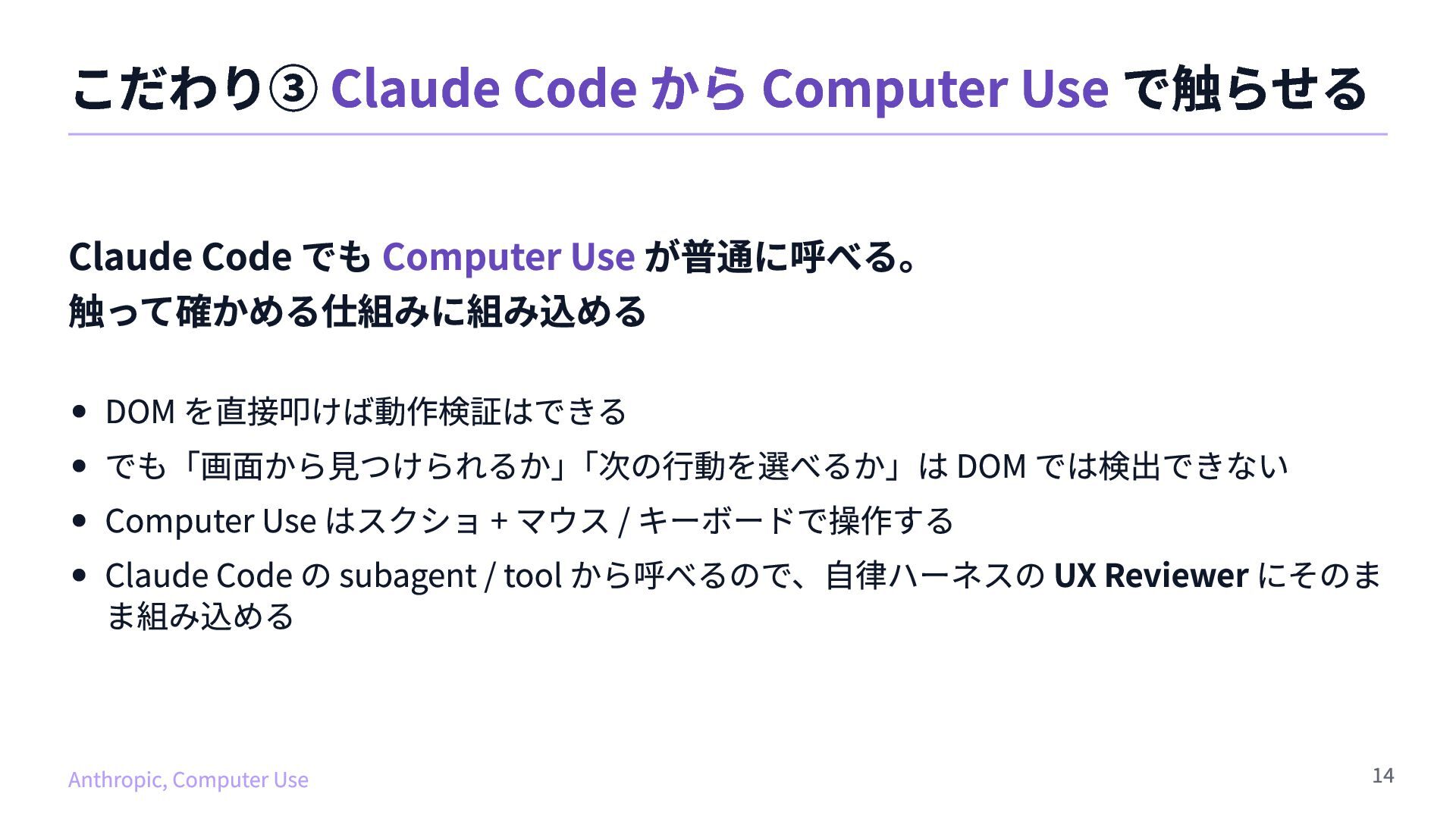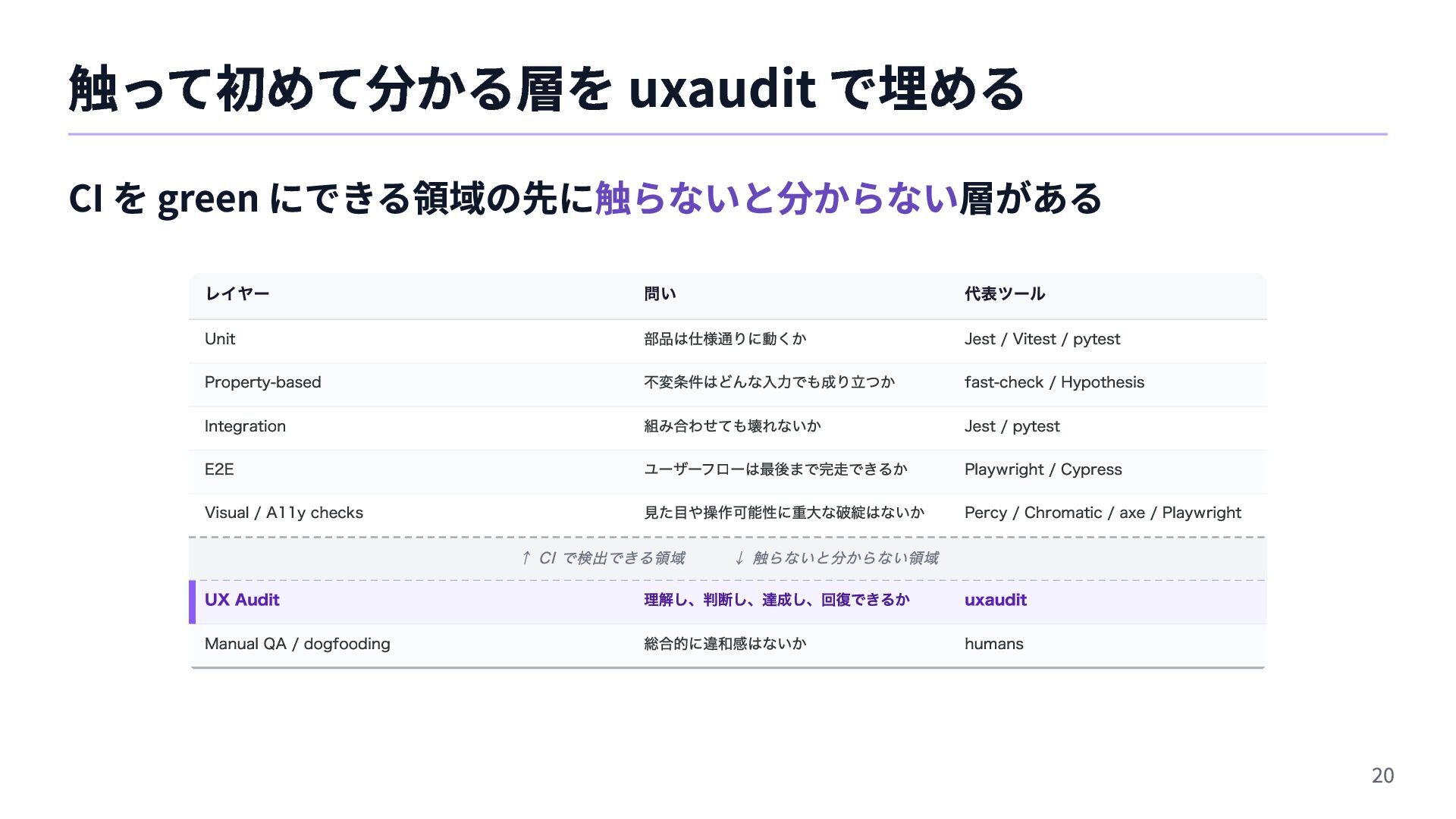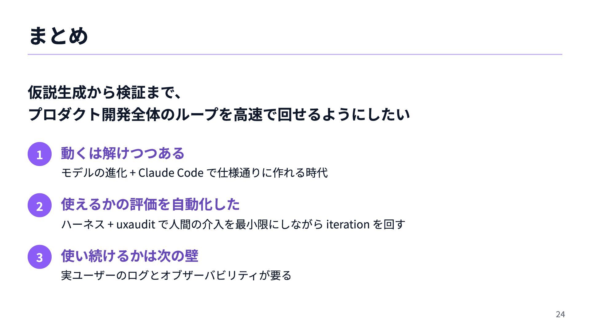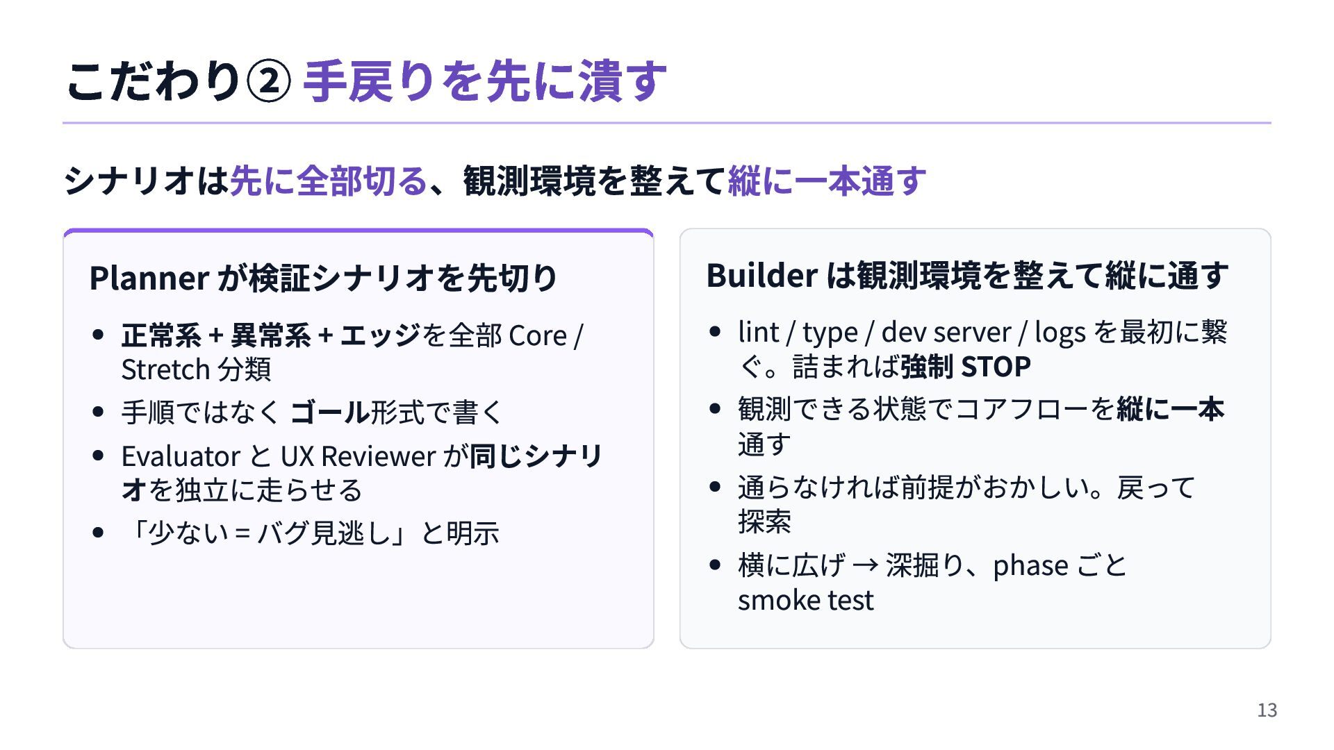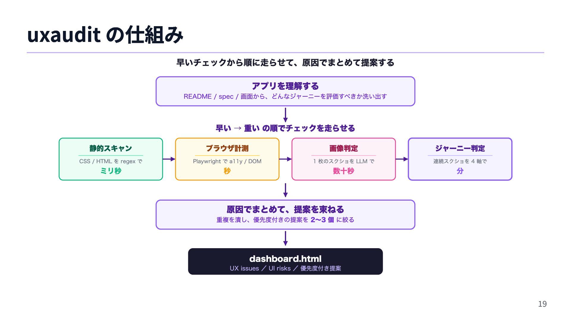 Claude Code Meetup Japan #4での発表資料。「仕様通りに動く」と「ユーザーが使える」の間にあるギャップを、Claude Code の自律ハーネスと uxaudit で埋める方法を紹介する。cc-sdd v3.0による長時間自律実装、Planner / Builder / Evaluator / UX Reviewer のシンプルなハーネス設計、Credo (5 原則) の Skill 注入、Computer Use による画面操作評価、uxaudit のジャーニー自動評価と iteration 比較 dashboardまで、実装から検証の一気通貫をカバーしている。実プロジェクトの dashboard、スクショを交えた実務者向けの内容。Claude Code でプロダクト開発を回している人、UX評価の自動化に関心がある人向け。