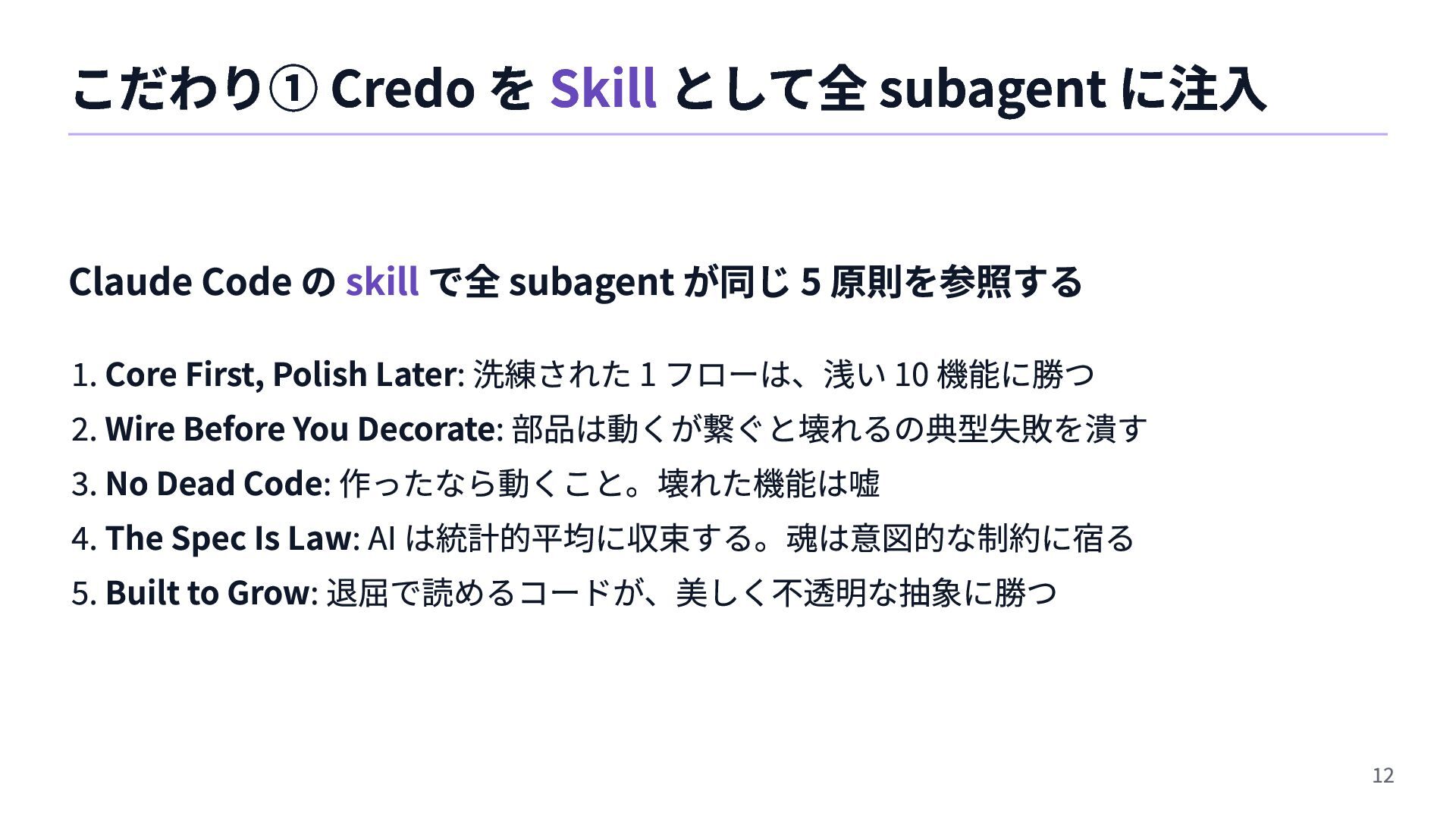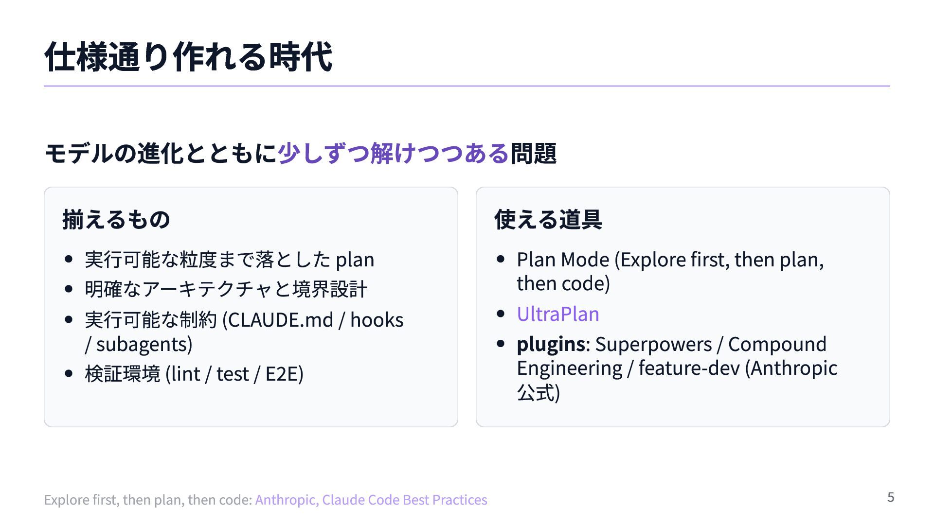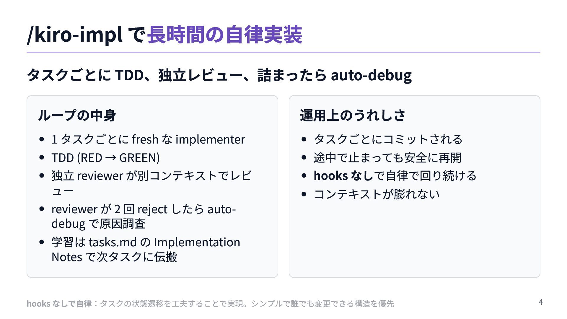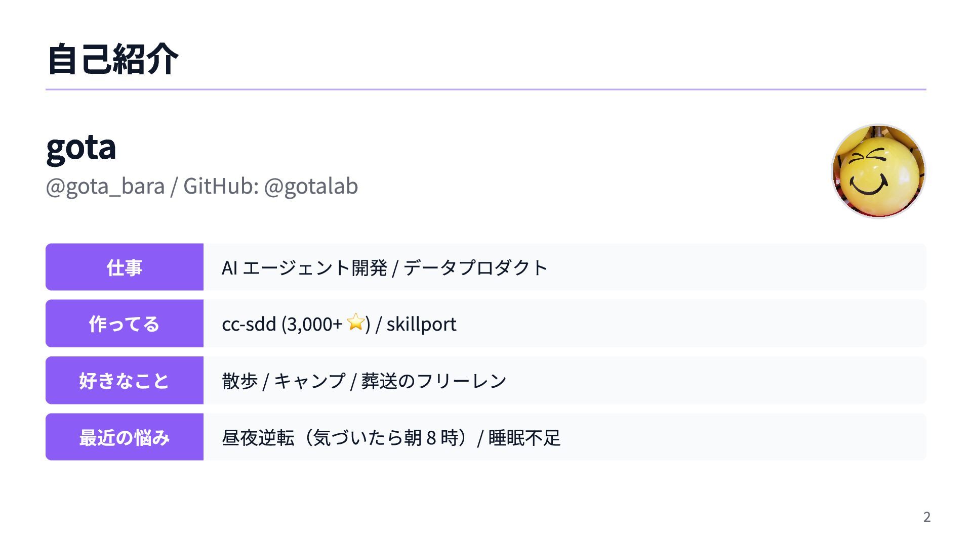 Claude Code Meetup Japan #4での発表資料。「仕様通りに動く」と「ユーザーが使える」の間にあるギャップを、Claude Code の自律ハーネスと uxaudit で埋める方法を紹介する。cc-sdd v3.0による長時間自律実装、Planner / Builder / Evaluator / UX Reviewer のシンプルなハーネス設計、Credo (5 原則) の Skill 注入、Computer Use による画面操作評価、uxaudit のジャーニー自動評価と iteration 比較 dashboardまで、実装から検証の一気通貫をカバーしている。実プロジェクトの dashboard、スクショを交えた実務者向けの内容。Claude Code でプロダクト開発を回している人、UX評価の自動化に関心がある人向け。