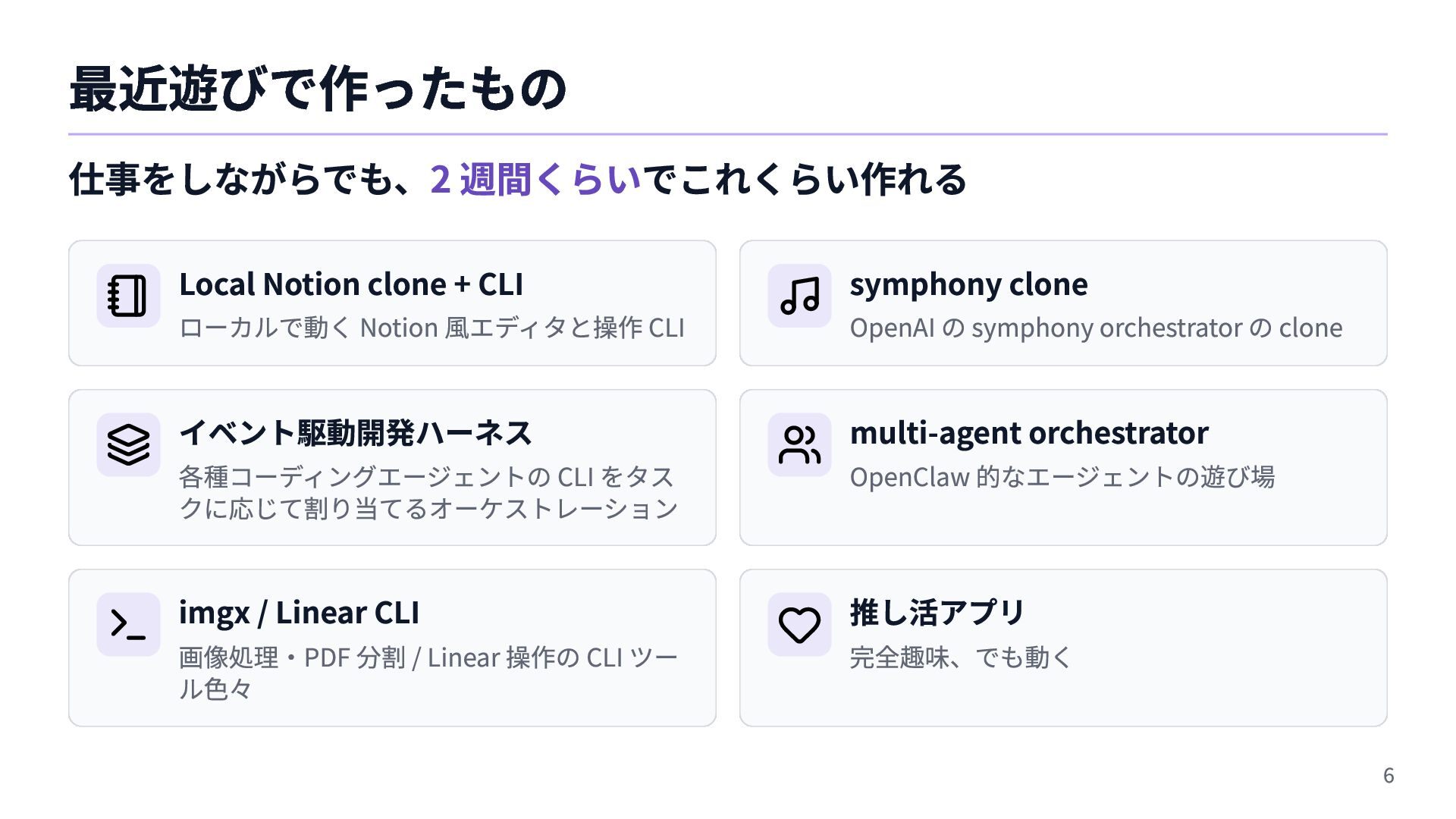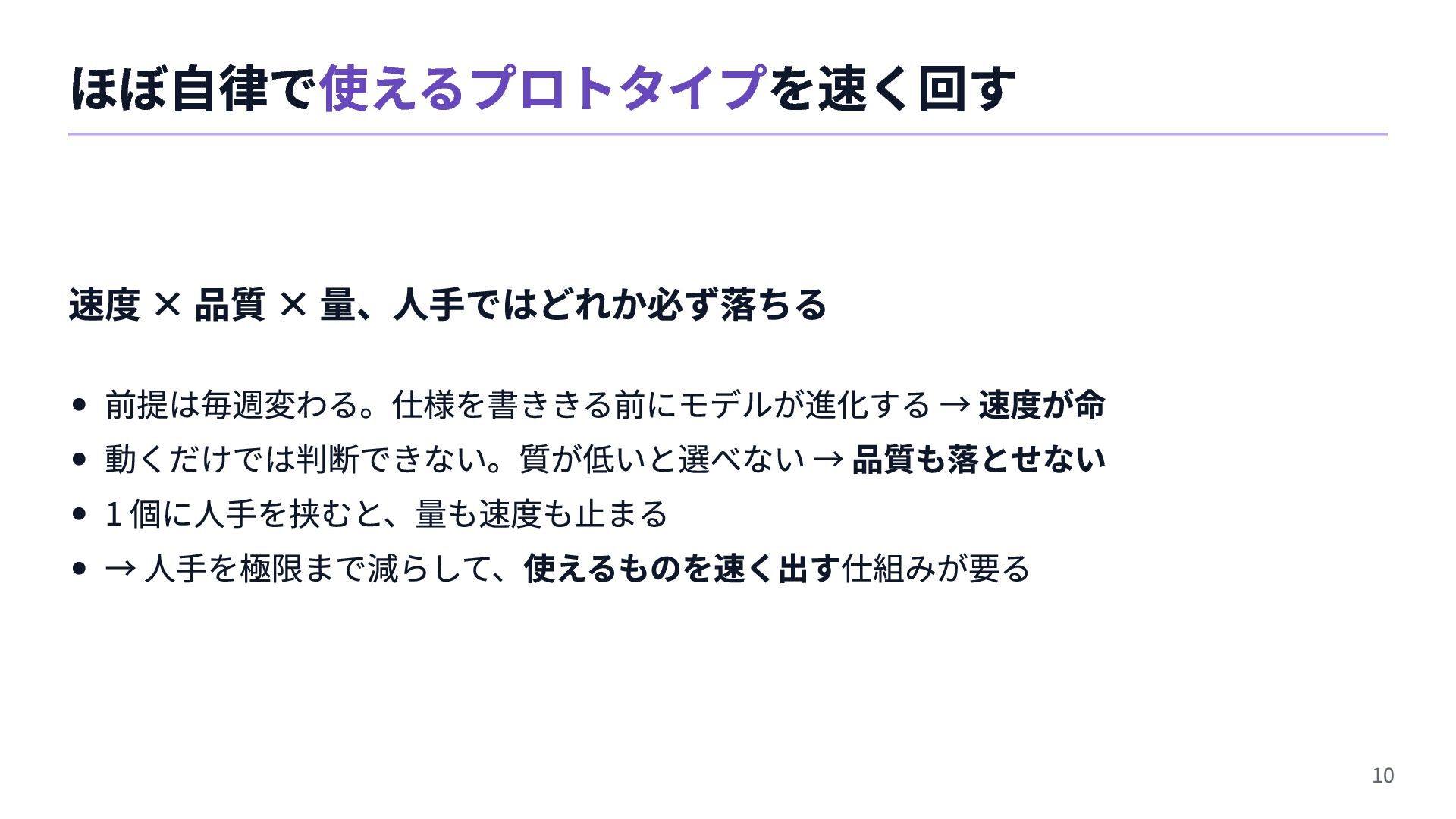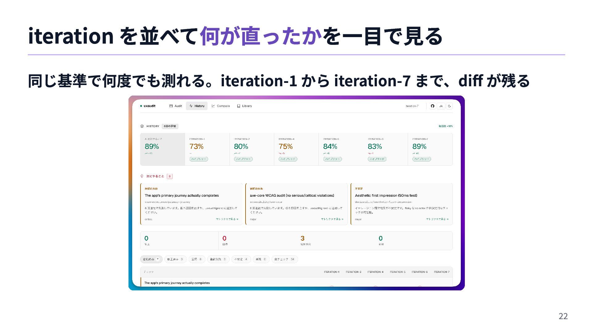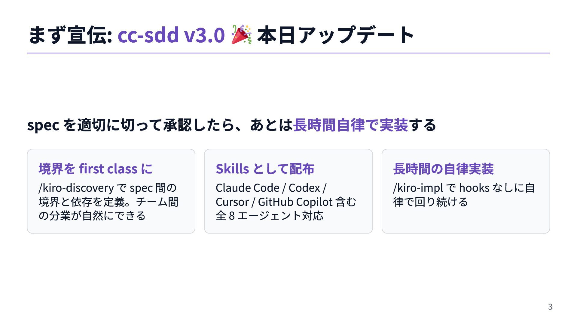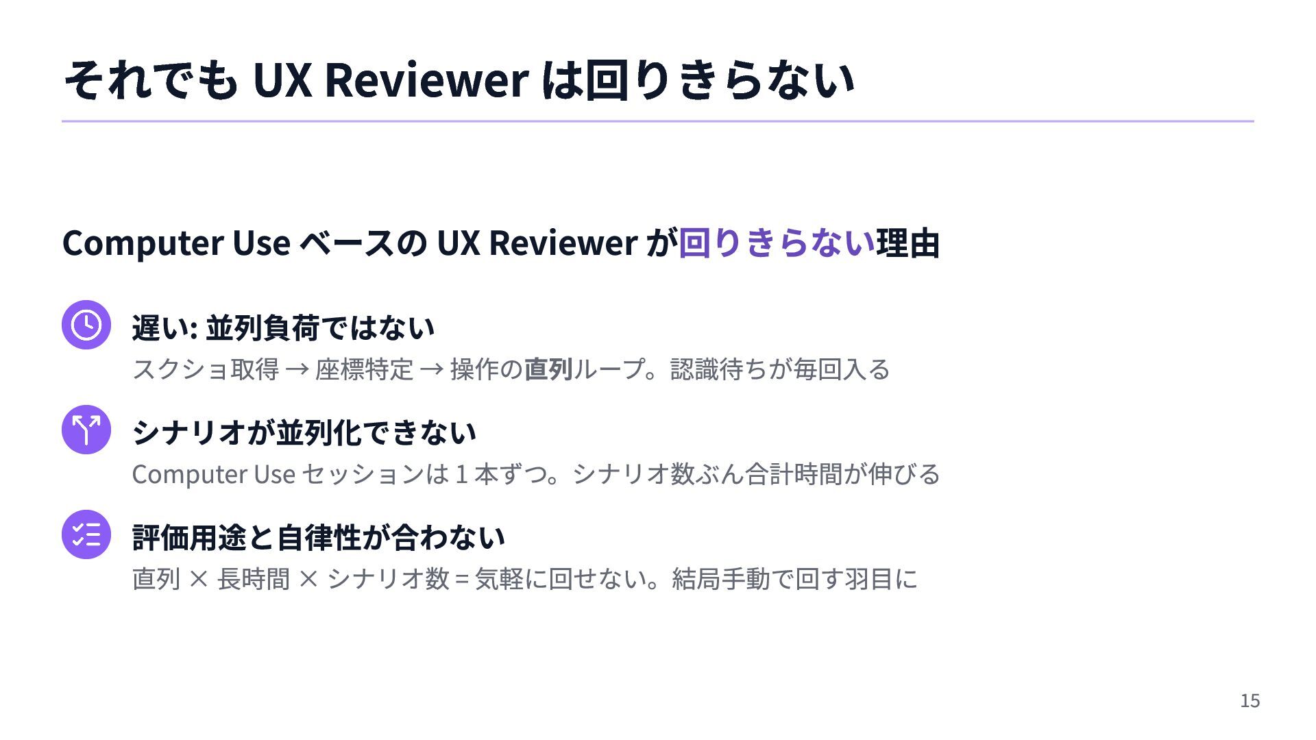 Claude Code Meetup Japan #4での発表資料。「仕様通りに動く」と「ユーザーが使える」の間にあるギャップを、Claude Code の自律ハーネスと uxaudit で埋める方法を紹介する。cc-sdd v3.0による長時間自律実装、Planner / Builder / Evaluator / UX Reviewer のシンプルなハーネス設計、Credo (5 原則) の Skill 注入、Computer Use による画面操作評価、uxaudit のジャーニー自動評価と iteration 比較 dashboardまで、実装から検証の一気通貫をカバーしている。実プロジェクトの dashboard、スクショを交えた実務者向けの内容。Claude Code でプロダクト開発を回している人、UX評価の自動化に関心がある人向け。