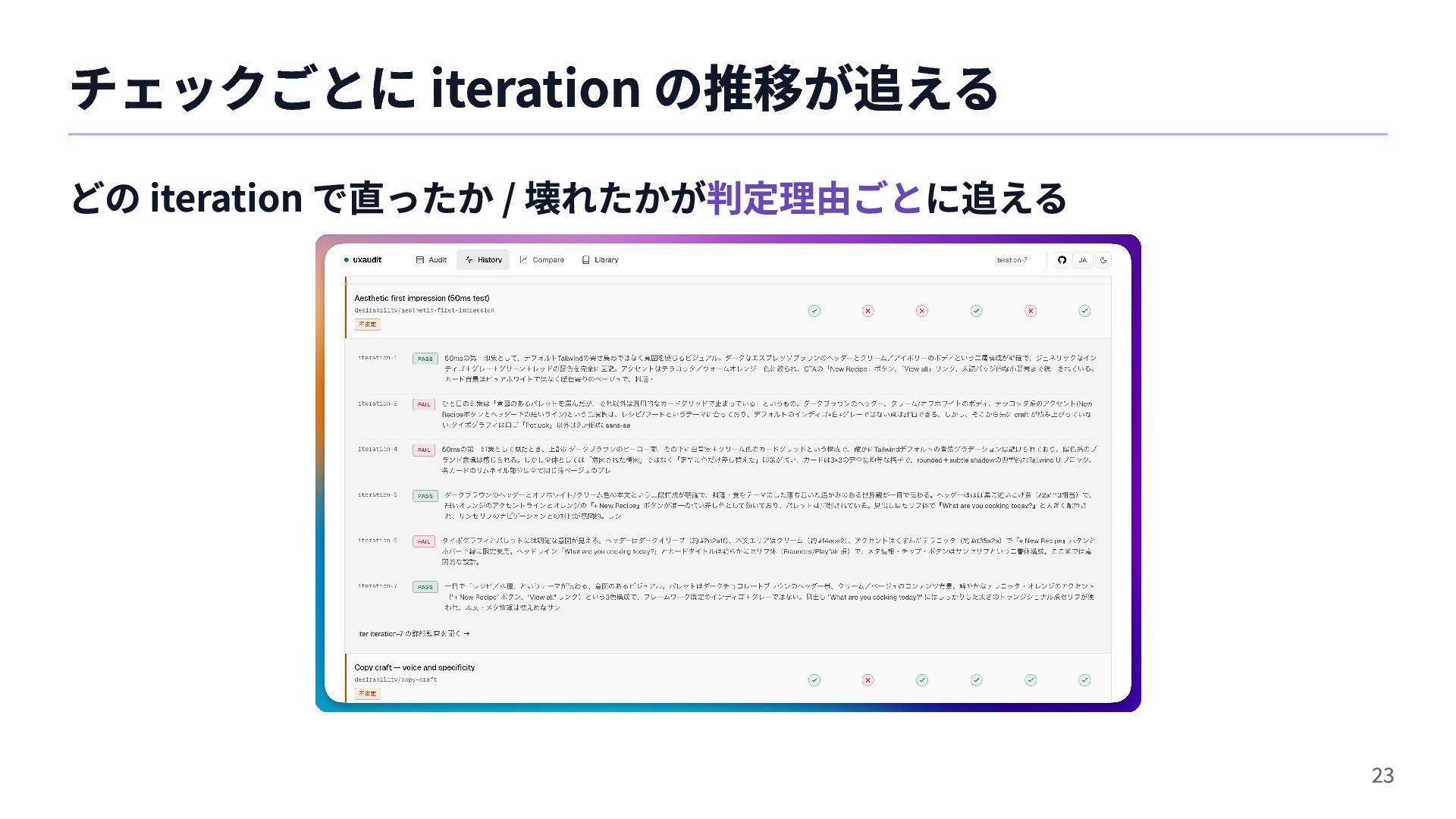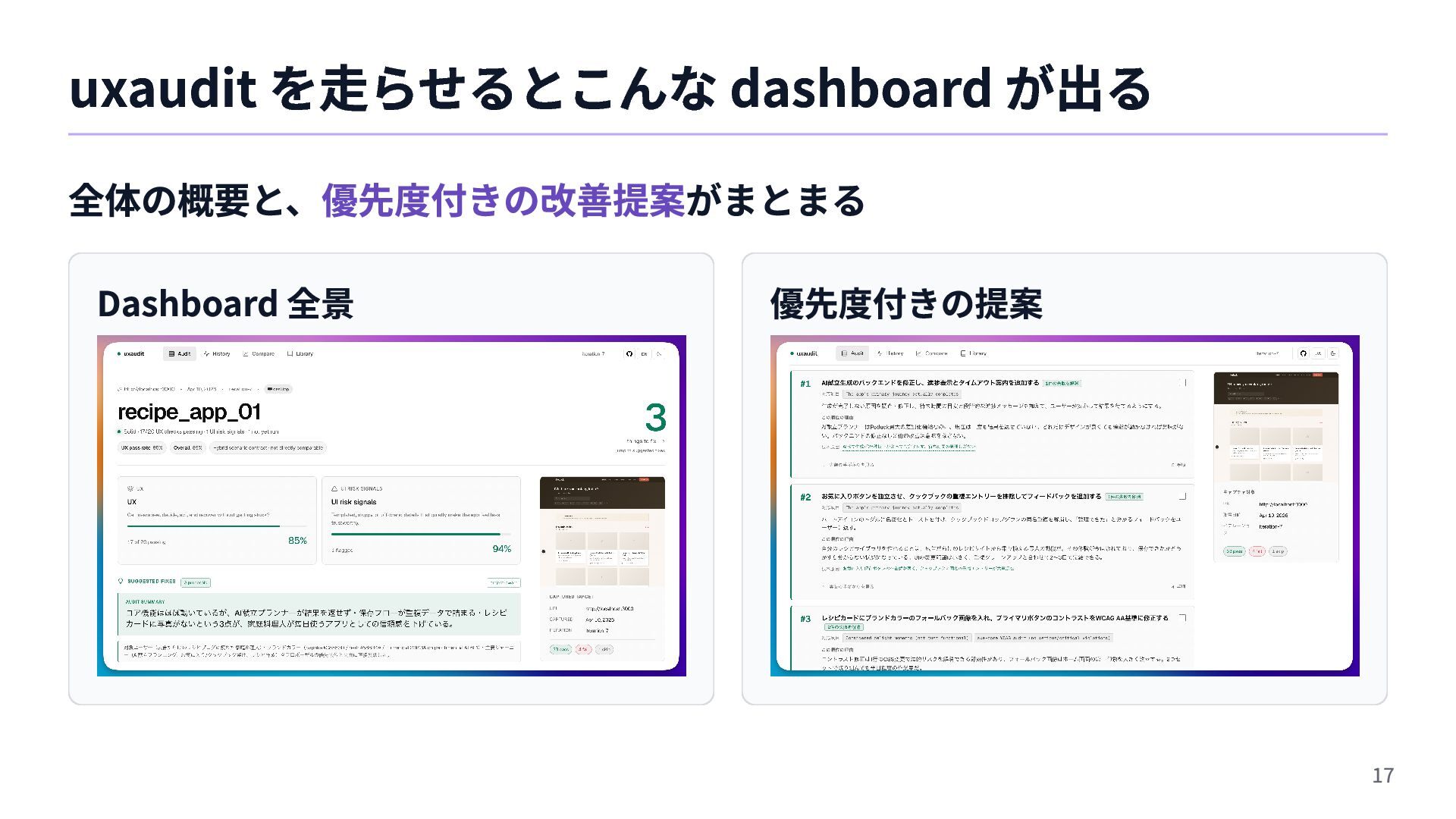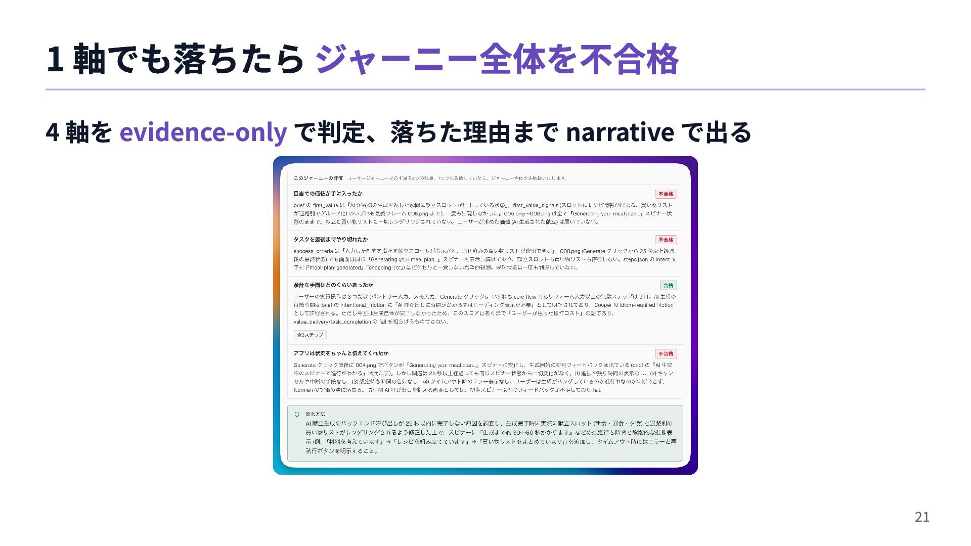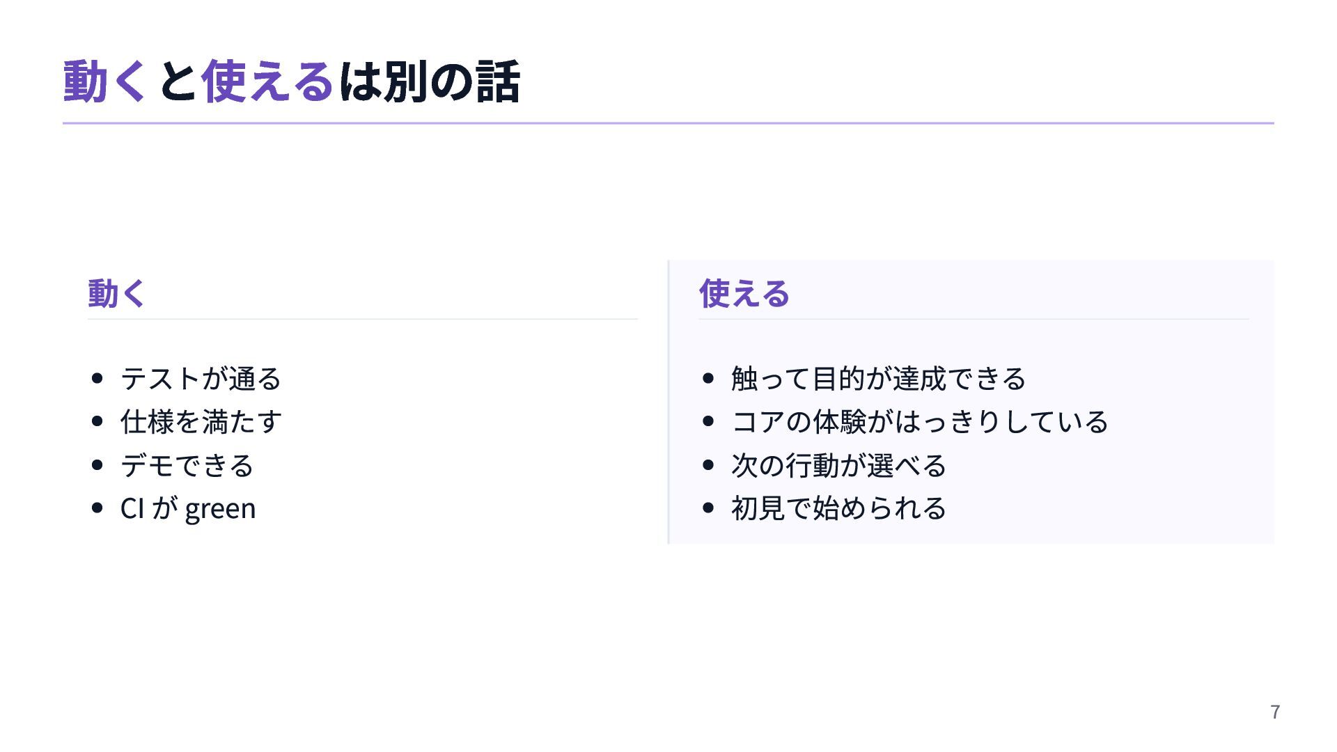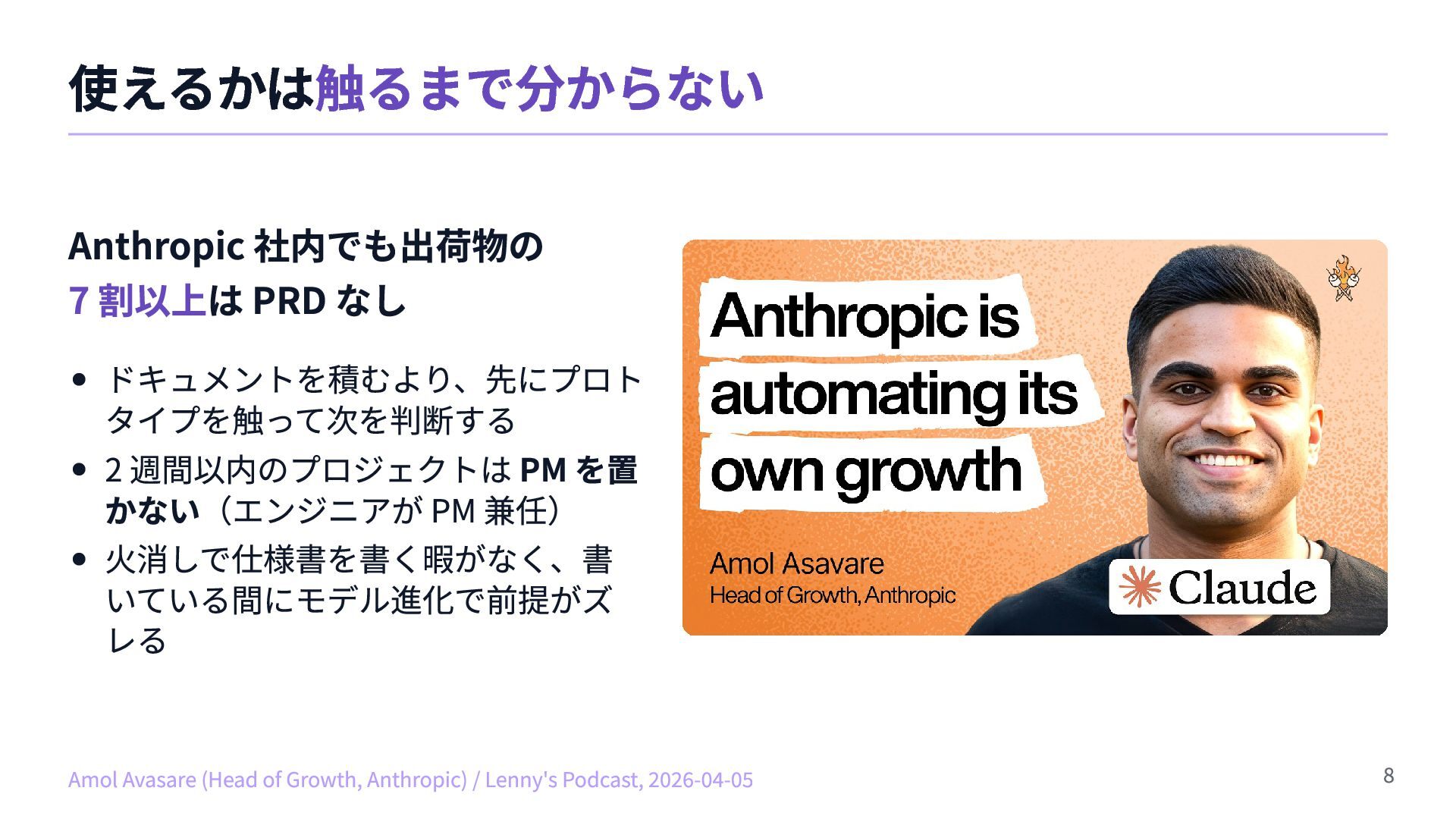 Claude Code Meetup Japan #4での発表資料。「仕様通りに動く」と「ユーザーが使える」の間にあるギャップを、Claude Code の自律ハーネスと uxaudit で埋める方法を紹介する。cc-sdd v3.0による長時間自律実装、Planner / Builder / Evaluator / UX Reviewer のシンプルなハーネス設計、Credo (5 原則) の Skill 注入、Computer Use による画面操作評価、uxaudit のジャーニー自動評価と iteration 比較 dashboardまで、実装から検証の一気通貫をカバーしている。実プロジェクトの dashboard、スクショを交えた実務者向けの内容。Claude Code でプロダクト開発を回している人、UX評価の自動化に関心がある人向け。