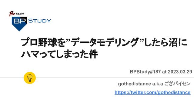 プロ野球を”データモデリング”したら沼に ハマってしまった件 gothedistance a.k.a ござパイセン https://twitter.com/gothedistance BPStudy#187 at 2023.03.29