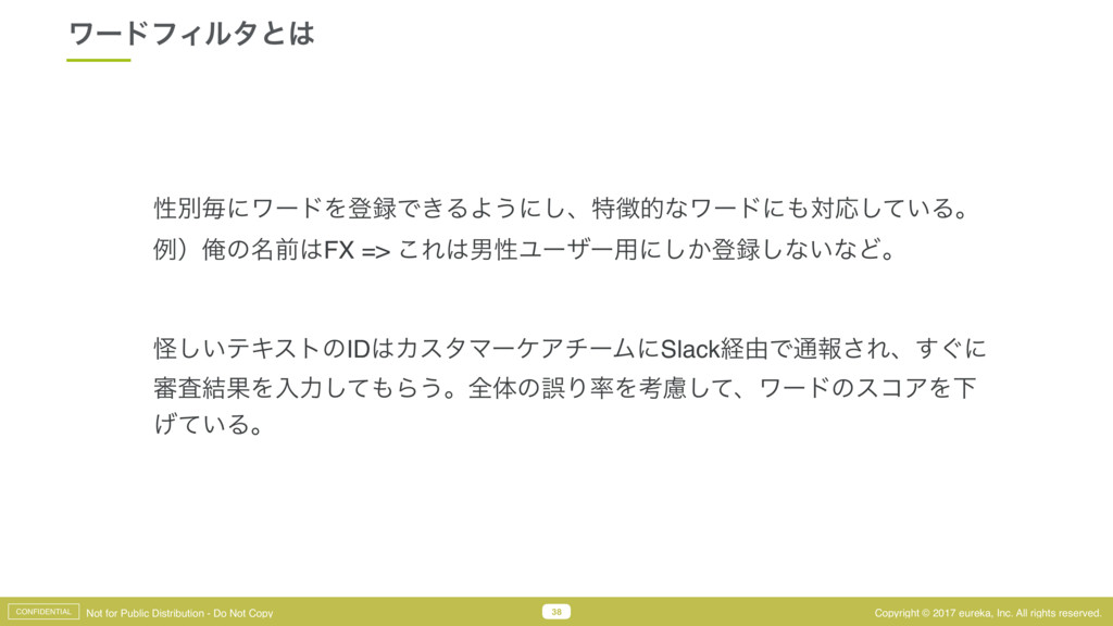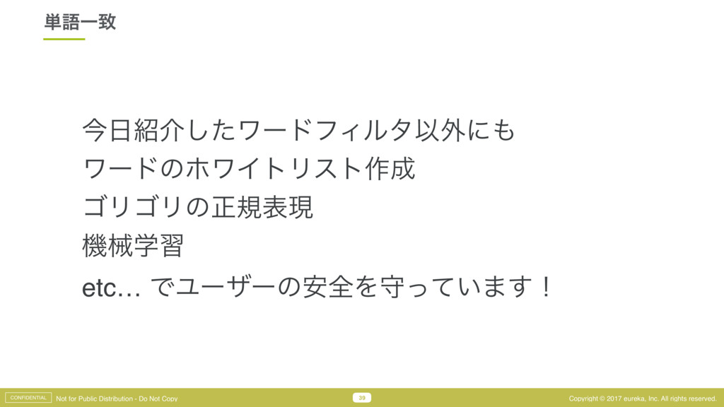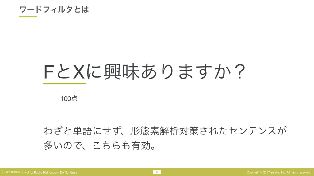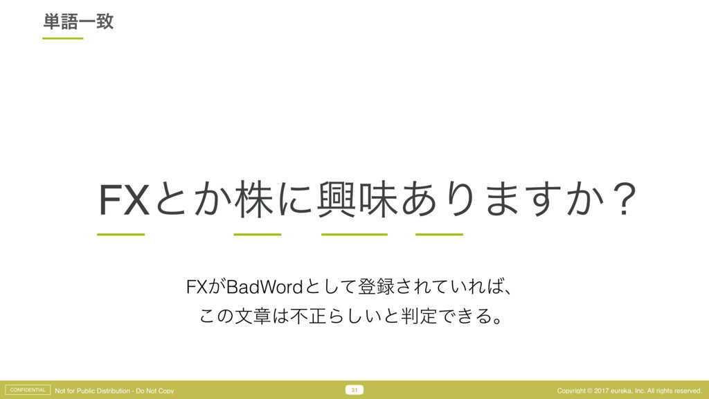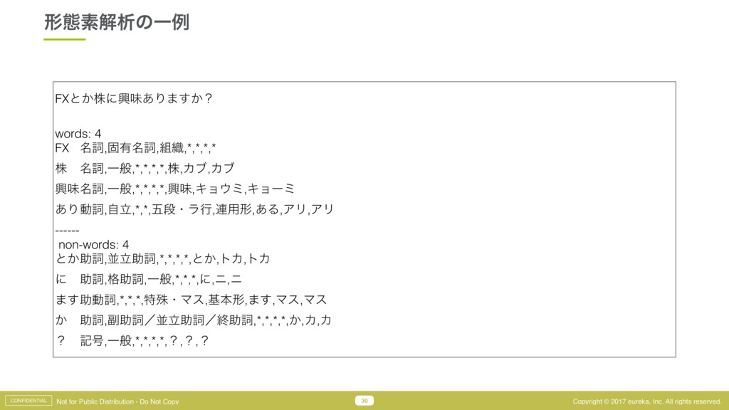 for Public Distribution - Do Not Copy 30 ܗଶૉղੳͷҰྫ FXͱ͔גʹڵຯ͋Γ·͔͢ʁ words: 4 FX ໊ࢺ,ݻ༗໊ࢺ,৫,*,*,*,* ג ໊ࢺ,Ұൠ,*,*,*,*,ג,Χϒ,Χϒ ڵຯ ໊ࢺ,Ұൠ,*,*,*,*,ڵຯ,Ωϣϛ,Ωϣʔϛ ͋Γ ಈࢺ,ཱࣗ,*,*,ޒஈɾϥߦ,࿈༻ܗ,͋Δ,ΞϦ,ΞϦ ------ non-words: 4 ͱ͔ ॿࢺ,ฒཱॿࢺ,*,*,*,*,ͱ͔,τΧ,τΧ ʹ ॿࢺ,֨ॿࢺ,Ұൠ,*,*,*,ʹ,χ,χ ·͢ ॿಈࢺ,*,*,*,ಛघɾϚε,جຊܗ,·͢,Ϛε,Ϛε ͔ ॿࢺ,෭ॿࢺʗฒཱॿࢺʗऴॿࢺ,*,*,*,*,͔,Χ,Χ ʁ ه߸,Ұൠ,*,*,*,*,ʁ,ʁ,ʁ