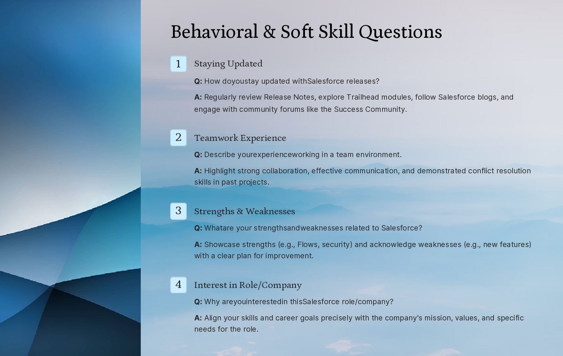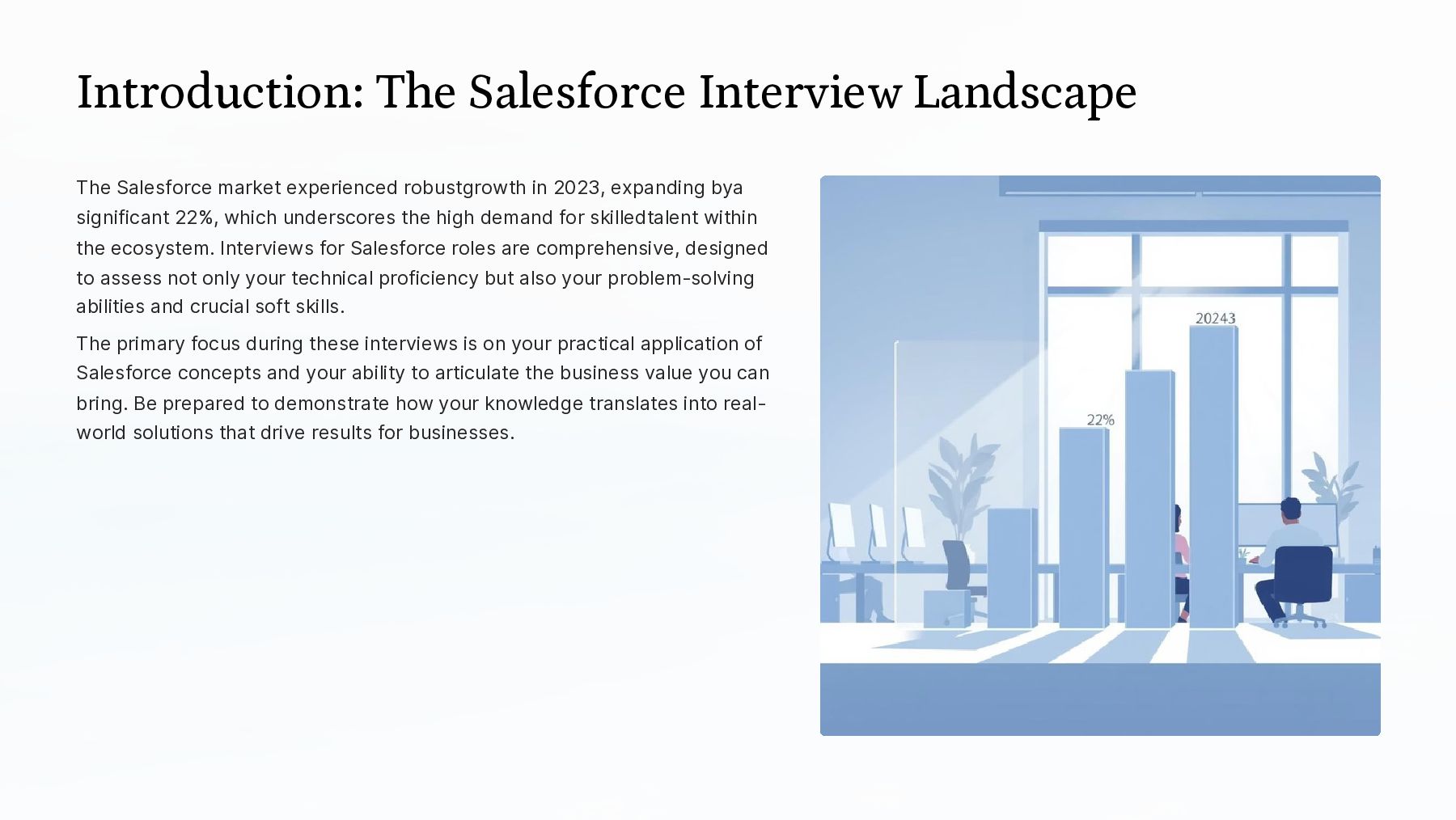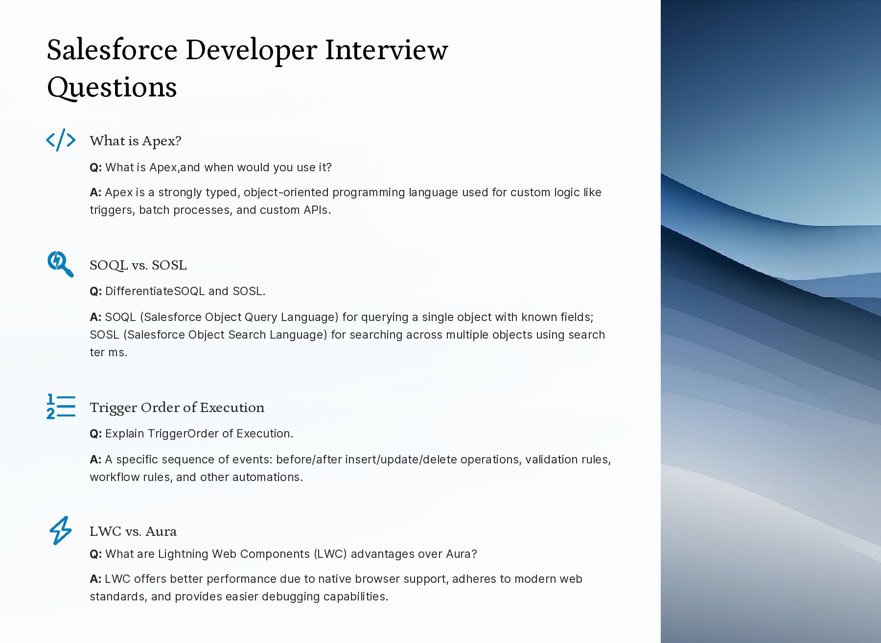 This PDF contains a curated list of frequently asked Salesforce interview questions and answers along with brief explanations. It's ideal for freshers, job seekers, and professionals preparing for Salesforce roles. Topics include objects, triggers, workflows, Apex, governor limits, and more. A quick reference guide to boost your interview confidence and understanding of core Salesforce concepts. By Scholarhat