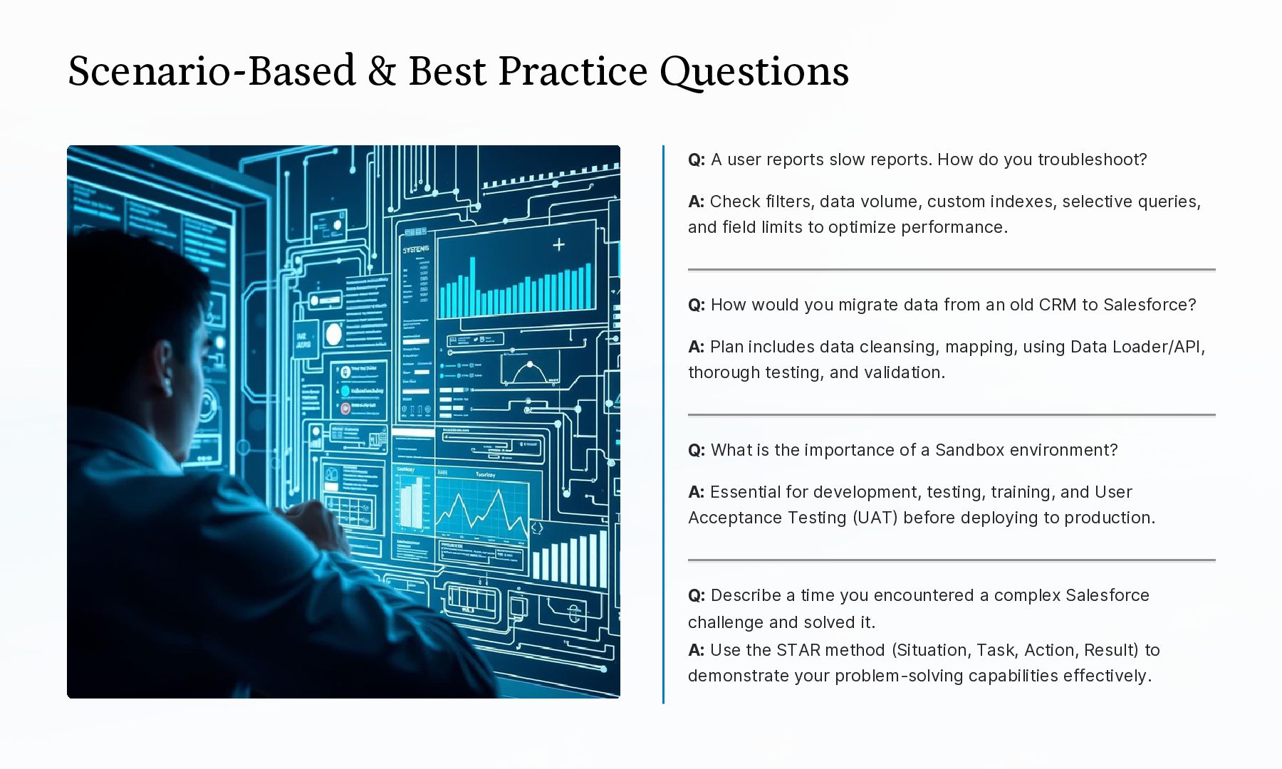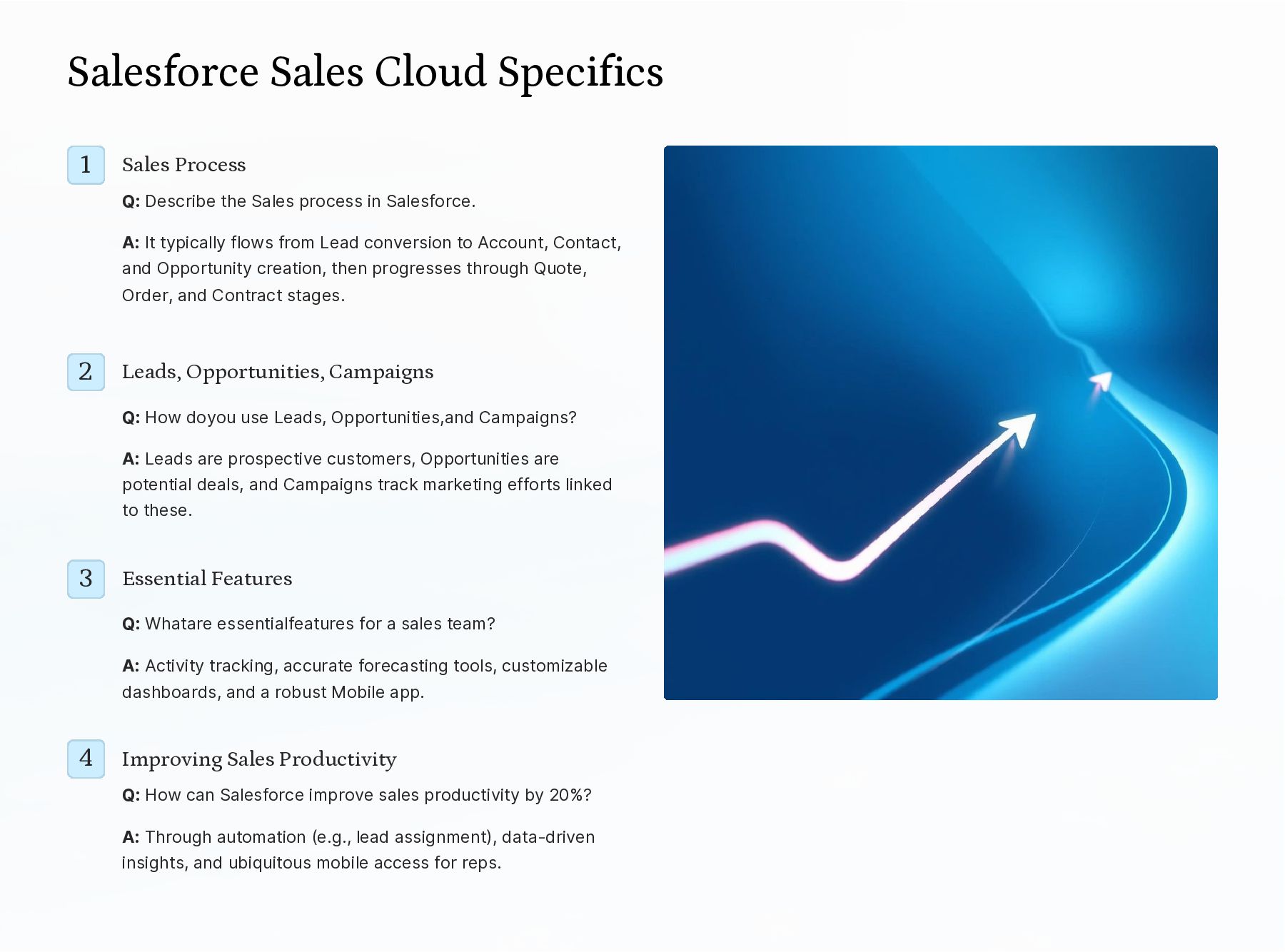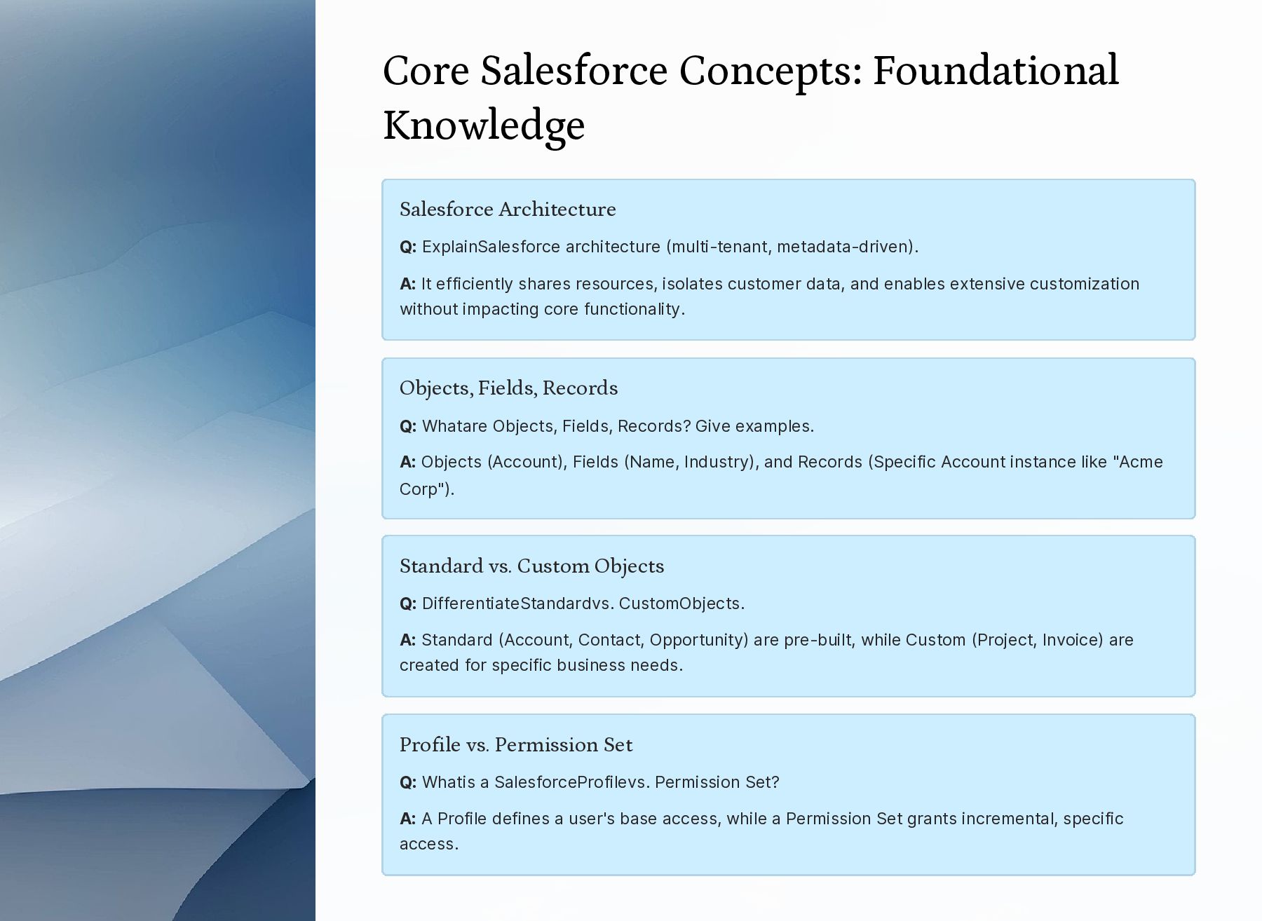 This PDF contains a curated list of frequently asked Salesforce interview questions and answers along with brief explanations. It's ideal for freshers, job seekers, and professionals preparing for Salesforce roles. Topics include objects, triggers, workflows, Apex, governor limits, and more. A quick reference guide to boost your interview confidence and understanding of core Salesforce concepts. By Scholarhat
