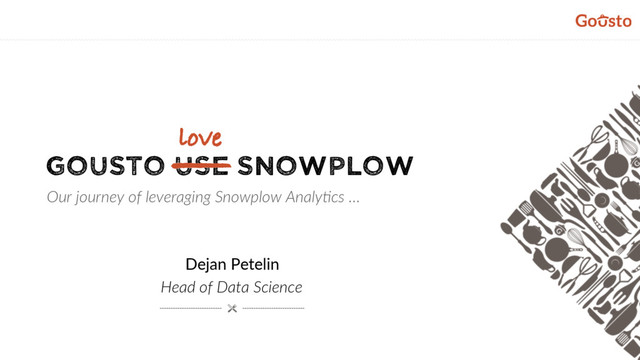 a subscrip@on service we are very retenDon focused – linking all the data sources is challenging. • We believe that data is the voice of our customers, so we try to collect as much data as possible. • Therefore we invested a lot in Snowplow as we own the data, which is very valuable asset and core of the business. • The data is available to everyone – SQL is a great competency at Gousto.