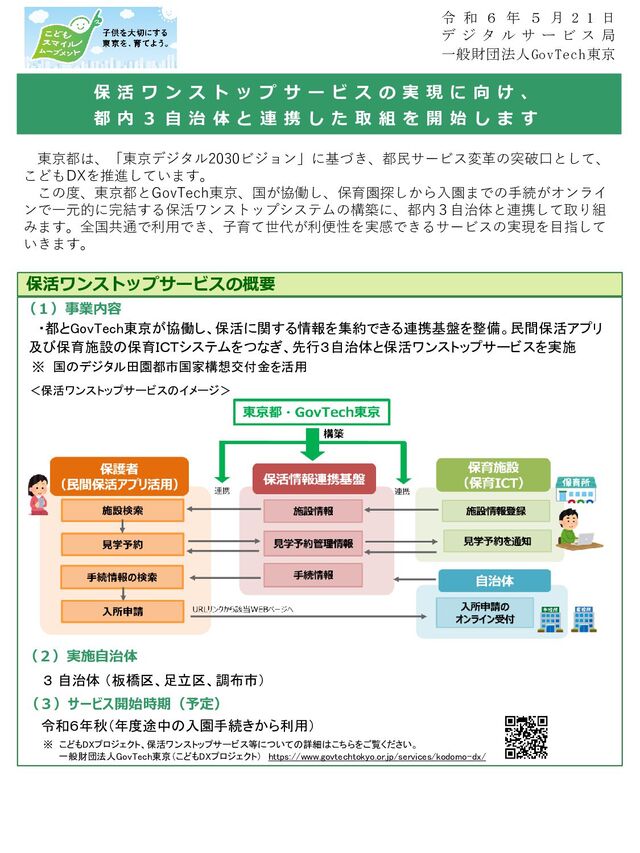 ー ビ ス の 実 現 に 向 け 、 都 内 3 自 治 体 と 連 携 し た 取 組 を 開 始 し ま す (1)事業内容 ・都とGovTech東京が協働し、保活に関する情報を集約できる連携基盤を整備。民間保活アプリ 及び保育施設の保育ICTシステムをつなぎ、先行3自治体と保活ワンストップサービスを実施 (2)実施自治体 (3)サービス開始時期(予定) 令和6年秋(年度途中の入園手続きから利用) 東京都は、「東京デジタル2030ビジョン」に基づき、都民サービス変革の突破口として、 こどもDXを推進しています。 この度、東京都とGovTech東京、国が協働し、保育園探しから入園までの手続がオンライ ンで一元的に完結する保活ワンストップシステムの構築に、都内3自治体と連携して取り組 みます。全国共通で利用でき、子育て世代が利便性を実感できるサービスの実現を目指して いきます。 3 自治体 (板橋区、足立区、調布市) 令 和 6 年 5 月 2 1 日 デ ジ タ ル サ ー ビ ス 局 一般財団法人GovTech東京 <保活ワンストップサービスのイメージ> ※ 国のデジタル田園都市国家構想交付金を活用 ※ こどもDXプロジェクト、保活ワンストップサービス等についての詳細はこちらをご覧ください。 一般財団法人GovTech東京(こどもDXプロジェクト) https://www.govtechtokyo.or.jp/services/kodomo-dx/