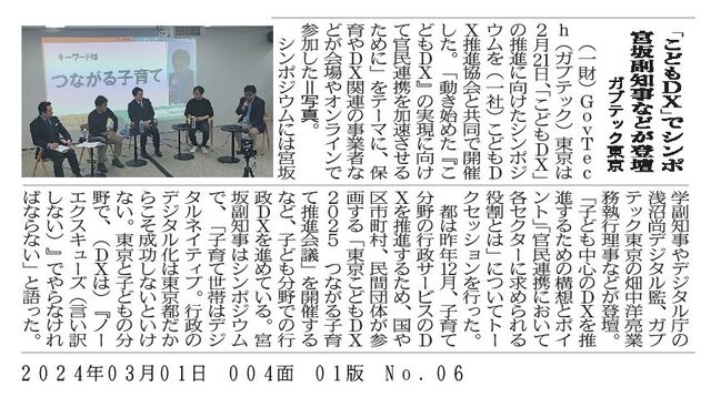 ポ 宮 坂 副 知 事 な ど が 登 壇 ガ ブ テ ク 東 京 ︵ 一 財 ︶ G o v T e c h ︵ ガ ブ テ ク ︶ 東 京 は 2 月 日 ﹁ こ ど も D X ﹂ の 推 進 に 向 け た シ ン ポ ジ ウ ム を ︵ 一 社 ︶ こ ど も D X 推 進 協 会 と 共 同 で 開 催 し た ﹁ 動 き 始 め た ﹃ こ ど も D X ﹄ の 実 現 に 向 け て 官 民 連 携 を 加 速 さ せ る た め に ﹂ を テ マ に 保 育 や D X 関 連 の 事 業 者 な ど が 会 場 や オ ン ラ イ ン で 参 加 し た 写 真 シ ン ポ ジ ウ ム に は 宮 坂 学 副 知 事 や デ ジ タ ル 庁 の 浅 沼 尚 デ ジ タ ル 監 ガ ブ テ ク 東 京 の 畑 中 洋 亮 業 務 執 行 理 事 な ど が 登 壇 ﹁ 子 ど も 中 心 の D X を 推 進 す る た め の 構 想 と ポ イ ン ト ﹂ ﹁ 官 民 連 携 に お い て 各 セ ク タ に 求 め ら れ る 役 割 と は ﹂ に つ い て ト ク セ シ ン を 行 た 都 は 昨 年 月 子 育 て 分 野 の 行 政 サ ビ ス の D X を 推 進 す る た め 国 や 区 市 町 村 民 間 団 体 が 参 画 す る ﹁ 東 京 こ ど も D X 2 0 2 5 つ な が る 子 育 て 推 進 会 議 ﹂ を 開 催 す る な ど 子 ど も 分 野 で の 行 政 D X を 進 め て い る 宮 坂 副 知 事 は シ ン ポ ジ ウ ム で ﹁ 子 育 て 世 帯 は デ ジ タ ル ネ イ テ ブ 行 政 の デ ジ タ ル 化 は 東 京 都 だ か ら こ そ 成 功 し な い と い け な い 東 京 と 子 ど も の 分 野 で ︵ D X は ︶ ﹃ ノ エ ク ス キ ズ ︵ 言 い 訳 し な い ︶ ﹄ で や ら な け れ ば な ら な い ﹂ と 語 た 2 0 2 4 年 0 3 月 0 1 日 0 0 4 面 0 1 版 N o . 0 6