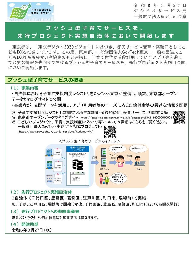 ー ビ ス を 、 先 行 プ ロ ジ ェ ク ト 実 施 自 治 体 に お い て 開 始 し ま す (1)事業内容 ・自治体における子育て支援制度レジストリをGovTech東京が整備し、順次、東京都オープン データカタログサイトに公開 ・事業者が、公開データを活用し、アプリ利用者等のニーズに応じた給付金等の最適な情報を配信 ※ 子育て支援制度レジストリに掲載される主な制度:金銭的給付、保育サービス、相談窓口等 ※ 東京都オープンデータカタログサイト https://catalog.data.metro.tokyo.lg.jp/dataset/t134211d0000000001 ※ こどもDXプロジェクト、子育て支援制度レジストリ等についての詳細はこちらをご覧ください。 一般財団法人GovTech東京(こどもDXプロジェクト) https://www.govtechtokyo.or.jp/services/kodomo-dx/ (2)先行プロジェクト実施自治体 (4)開始時期 (3)先行プロジェクトへの参画事業者 別紙のとおり ※自治体毎に対応事業者は異なります。 令和6年3月27日(水) 東京都は、「東京デジタル2030ビジョン」に基づき、都民サービス変革の突破口としてこ どもDXを推進しています。この度、東京都、一般財団法人GovTech東京、一般社団法人こ どもDX推進協会が3者協定のもと連携し、子育て世代が普段利用しているアプリ等を通じ て必要な情報を先回りで届けるプッシュ型子育てサービスを、先行プロジェクト実施自治体 において開始します。 6自治体 (千代田区、豊島区、葛飾区、江戸川区、町田市、瑞穂町)で実施 ※まずは、江戸川区、瑞穂町で開始 (今後、千代田区、豊島区、葛飾区、町田市においても順次開始) 令 和 6 年 3 月 2 7 日 デ ジ タ ル サ ー ビ ス 局 一般財団法人GovTech東京 <プッシュ型子育てサービスのイメージ>
