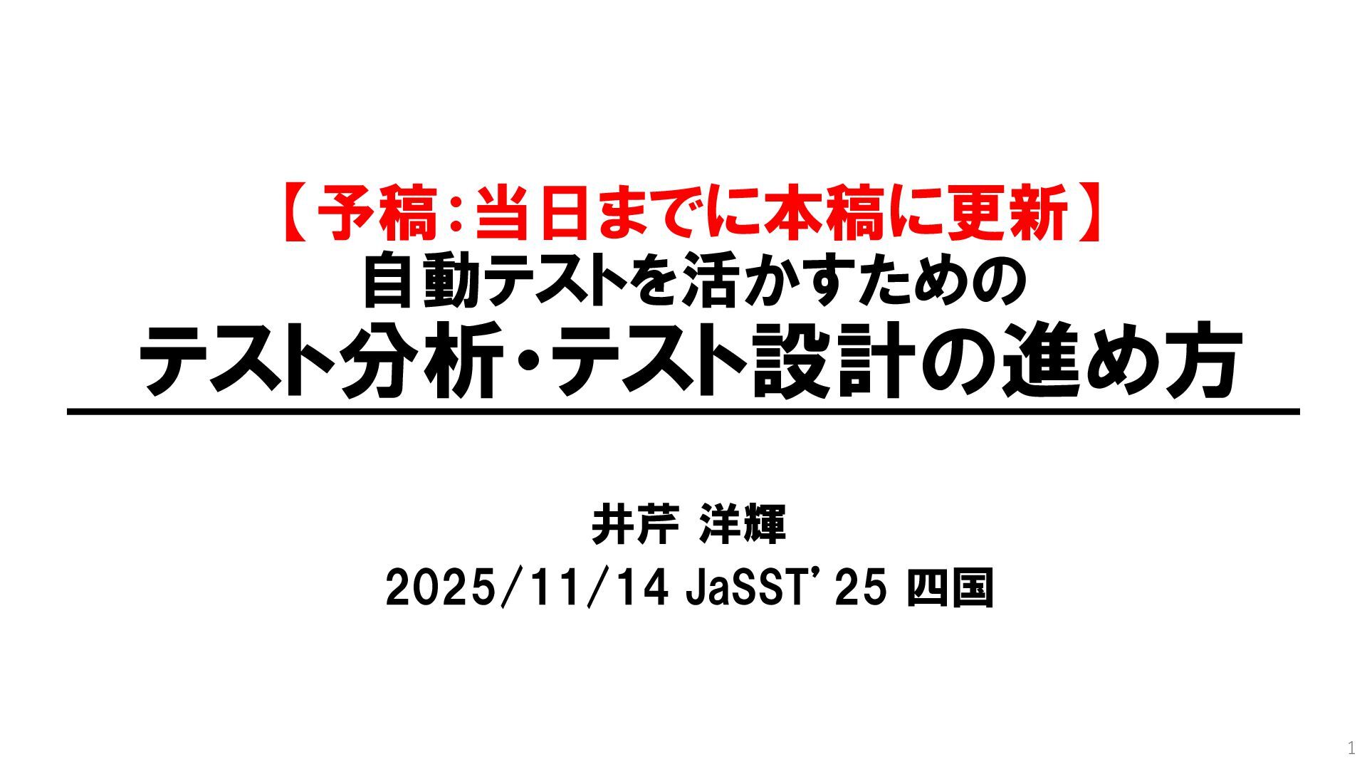 【予稿:当日までに本稿に更新】 自動テストを活かすための テスト分析・テスト設計の進め方 井芹 洋輝 2025/11/14 JaSST’25 四国 1