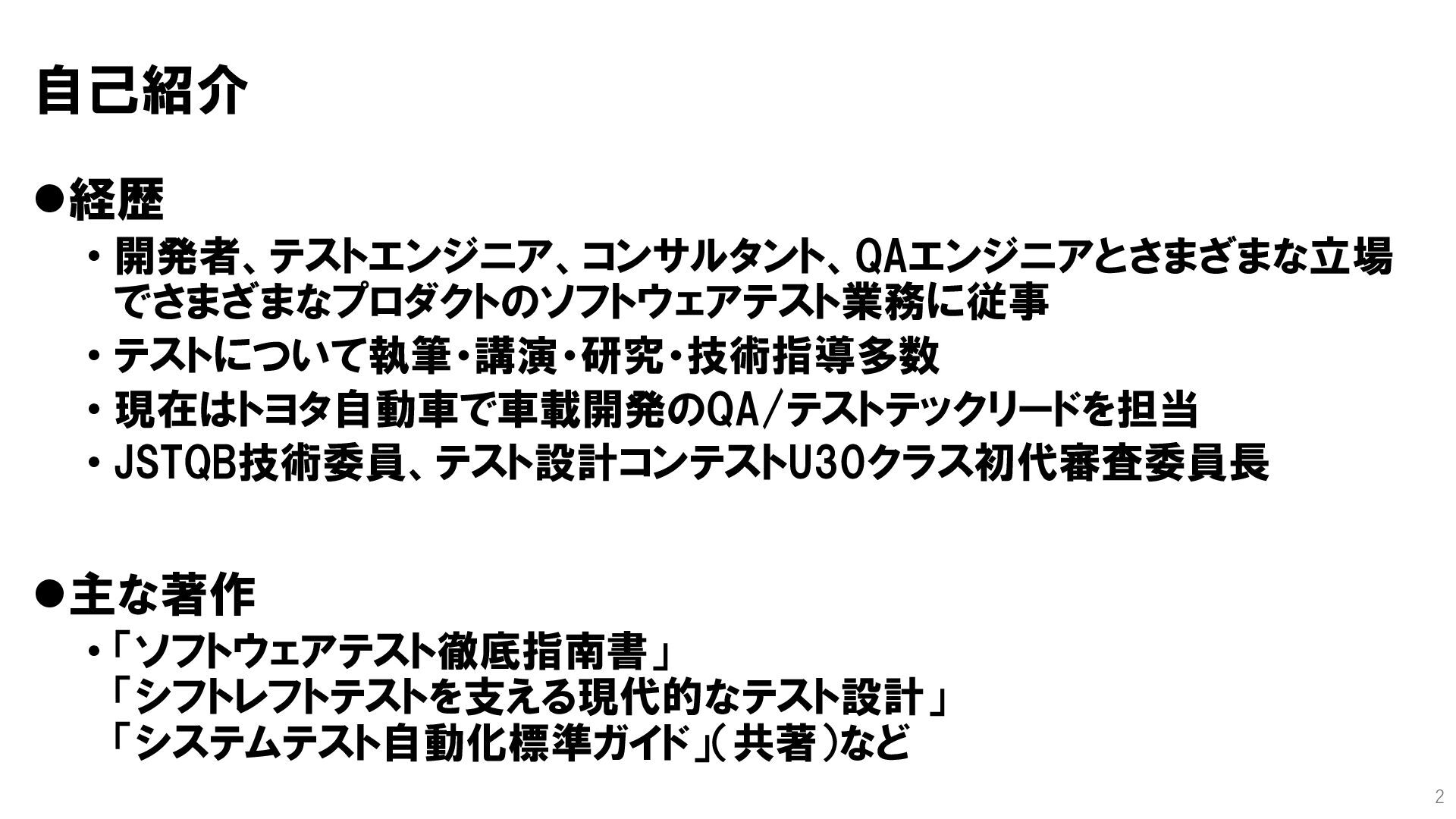 自己紹介 ⚫経歴 • 開発者、テストエンジニア、コンサルタント、QAエンジニアとさまざまな立場 でさまざまなプロダクトのソフトウェアテスト業務に従事 • テストについて執筆・講演・研究・技術指導多数 • 現在はトヨタ自動車で車載開発のQA/テストテックリードを担当 •