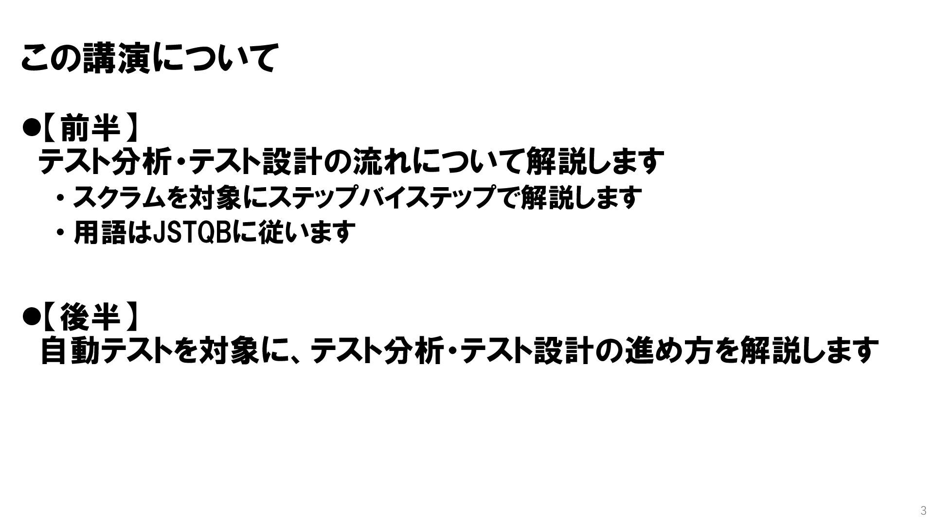 この講演について ⚫【前半】 テスト分析・テスト設計の流れについて解説します • スクラムを対象にステップバイステップで解説します • 用語はJSTQBに従います ⚫【後半】 自動テストを対象に、テスト分析・テスト設計の進め方を解説します 3