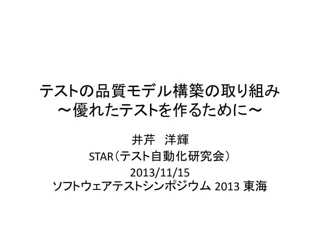 リスクやリスクコントロール手段に対する網羅性 ・構造網羅性 コードやグラフ等の構造に対する網羅性 ・各種カバレッジ ・テスト対象観点に対する網羅率 ・テスト設計のピンポイント性 テスト目的を必要最小限のテスト領域で達成 しているかの度合 ・テスト設計の重複の少なさ 網羅すべき実行領域をどの程度重複なく網羅できて いるかの度合 ・工数当たりの各種カバレッジ •テストの合目的性 ・保証容易性 保証基準の達成がどの程度容易かの度合 Ex)リリース可能な品質を保証しやすいか? ― ・保証基準チェックリストの達成 度 ・欠陥検出の容易性 欠陥検出をどの程度支援するかの度合 ― ・テストケースメソッド当たりのテ ストアサーション数 ・指標獲得容易性 取得を目的とする指標を、どの程度容易に取 得できるかの度合 ― ― ・テスト設計の標準適合性 外部の標準や基準に対するテスト設計の適 合度 ・カバレッジ計測容易性 カバレッジ計測をどこまでできるか? ・監査チェックリストの合格率 •テスト環境の機能 適合性 ・テスト環境の正確性 テストやテスト実行に必要な機能をどの程度 正確に実行できるかの度合 ・テスト実施正確性 テスト実施をどの程度正確に実行できるかの度合 ― ・テスト環境の完全性 実施できるテストや機能が、要求や目的をど の程度包含しているかの度合 ・テスト実施完全性 実施できるテストがテスト設計をどの程度包含してい るかの度合 ― ・テスト環境の適切性 定められたテスト関連機能のタスクを遂行で きるかの度合 ― ― テストシステムの品質特性(詳細)