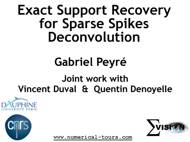 ( x, ·)d m ( x ) ' ( x, t ) = e xt Laplace transform: ' ( x, ·) x = 2 x = 20 Total internal reflection fluorescence microscopy (TIRFM) t (m1) (m2) x m1 t m2 x [with E. Soubies] [Boulanger et al. 2014] varying the azimuth φ during the exposure time and can be modeled by the following expression: gðθÞ = Z2π 0 Z∞ 0 Z∞ −∞ Iðz; α; φÞρ θ − α Ω=cos θ f À z Á dαdzdφ; where fðzÞ is the density of fluorophores in the medium con- volved by the emission point spread function and ρð · Þ represents the laser beam profile of divergence Ω. The function Iðz; α; φÞ slope of the glass slide recovered (Fig. 2D), the latter falling within the confidence interval deducted from the accuracy of the mea- surement of the different characteristic dimensions of the sample. Finally, from the dispersion of the estimated depth around the average slope (Fig. 2D), we can conclude that the localization precision obtained with this approach is higher than the corre- sponding precision given by estimating the location of the beads in the WF image stack as already mentioned (17). Estimating the 3D density of fluorophores convolved by the emission point spread function then would simply boil down to inverting the linear system. Some care has to be taken when inverting such system, as the inverse problem is at best badly con- ditioned. Nevertheless, constraints can be imposed to the solution such as positivity, and, in the case of time-lapse acquisitions, a multiframe regularization can be used in addition to the spatial and temporal regularization smoothness to solve the reconstruction problem. Moreover, to be effective, such a positivity constraint requires a correct knowledge of the background level. As a conse- quence, for each multiangle image stack, a background image is obtained by driving the beam out of the objective. Given that several convex constraints have to be satisfied at the same time, we propose to rely on a flavor of the PPXA algorithm (26) to estimate the tridimensional density of fluorophores (Fig. S4). More detailed information on how noise, object depth, and the required number of angles can be taken into account is discussed in SI Imaging Model and Reconstruction and Fig. S5. Finally, to take into account the variations of the medium index, we select an effective index within a predefined range by minimizing the reconstruction error at each pixel under a spatial smoothness constraint (Fig. S6). It is worth noting that the computation time for the reconstruction on 10 planes from a stack 512 × 512 images corresponding to 21 in- cidence angles ranges from 1 to 5 min depending on the number of iterations. Imaging in Vitro and in Vivo Actin Assembly. The proposed multi- angle TIRF image reconstruction approach was then tested on complex samples such as actin network architectures for which spatial resolution and dynamics remain an issue. We first chal- lenged the spatial organization of actin nucleation geometry using an in vitro assay based on micropatterning method (27). A B C D Fig. 2. Experimental validation of the multiangle TIRF model. (A) Schema of the system designed to create a slope of fluorescent beads. (B) Overlay of the maximum intensity projection of image stack acquired with WF and TIRF illumination. (Scale bar: 5 μm.) The evolution of the intensity versus the illumination angle θ of two selected beads are plotted in C with the corre- sponding fitting theoretical model (continuous line) for their estimated depth (respectively 10 and 89 nm). (D) Depth of all of the beads estimated by fitting the theoretical TIRF model (in red) and the depth of the same beads estimated by fitting a Gaussian model in the WF image stack (in green). BIOPHYSICS AND COMPUTATIONAL BIOLOGY slope of the glass slide recovered (Fig. 2D), the confidence interval deducted from the surement of the different characteristic dim Finally, from the dispersion of the estima average slope (Fig. 2D), we can conclude precision obtained with this approach is h sponding precision given by estimating the l the WF image stack as already mentioned Estimating the 3D density of fluoroph emission point spread function then woul inverting the linear system. Some care h inverting such system, as the inverse proble ditioned. Nevertheless, constraints can be i such as positivity, and, in the case of tim multiframe regularization can be used in add temporal regularization smoothness to so problem. Moreover, to be effective, such requires a correct knowledge of the backgro quence, for each multiangle image stack, obtained by driving the beam out of the several convex constraints have to be satisfie propose to rely on a flavor of the PPXA alg A B C D Fig. 2. Experimental validation of the multiangle TIRF model. (A) Schema of the system designed to create a slope of fluorescent beads. (B) Overlay of the maximum intensity projection of image stack acquired with WF and ✓(t) y(t) light depth x cell y(t) = m(t) ✓(t) ! multiple angles ✓(t). N = 1 N = 2 N = 3 ⌘W ⌘W ⌘W ¯ x = 2 ¯ x = 20 Non-translation-invariant operator ¯ x x1 x2 ! ⌘W depends on ¯ x! Proposition: In particular, ⌘W is non-degenerate. ⌘W ( x ) = 1 ✓ x ¯ x x + ¯ x ◆2N
