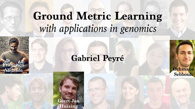 Figure 2. Illustration on the 1-D torus. (top, left) histograms whose translations form B1 , associated to the singular vectors B1 , B2 , B3 for varying values of ⌧ ; (top, right) functio right) convergence rate of the power iterations for ⌧ = 0.1, according to the d H metric. proposition, proved in Appendix C, states that for large enough regularization, uniqueness and linear convergence are maintained. Proposition 2.6. For ⌧ large enough, the singular vectors are unique and the power iterations (4) converge linearly for k·k1 . When ⌧ ! 1, the singular vectors converge to Convergence ra scale the conve to the Hilbert m kZkV := max(Z suggesting that singular vectors Translated histograms: M i,j = h(i − j) Unsupervised Ground Metric Learning Using Wasserstein Singular Vectors 0 20 40 60 80 Figure 2. Illustration on the 1-D torus. (top, left) histograms whose translations form B1 , B2 , B3 ; (bottom, left) distance associated to the singular vectors B1 , B2 , B3 for varying values of ⌧ ; (top, right) functions h1 , h2 , h3 generating the dat right) convergence rate of the power iterations for ⌧ = 0.1, according to the d H metric. α 0 α i i c(0,⋅) Input histograms Singular vector c are singular vectors of ( 1 A , 1 B ), with singular value 2 2. This proposition shows that for " = +1 a set of positive singular vectors is obtained as simply squared Euclidean distances over 1-D principal component embeddings of the data. Entropic regularization thus draws a link between our novel set of OT-based metric learning techniques and classical dimensionality reduction methods. This frames Sinkhorn singular vectors as a well-posed problem regard- less of the value of ". 5. Metric Learning for Single-Cell Genomics between precomputed Gene2Vec (Du et al., 2019) embed- dings. (Huizing et al., 2021) use a Sinkhorn divergence with a cosine distance between genes (i.e. vectors of cells) as a ground cost. In the present paper we compute OT distances using the Python package POT (Flamary et al., 2021). Dataset A commonly analyzed scRNA-seq dataset is the “PBMC 3k” dataset produced by 10X Genomics, obtained through the function pbmc3k of Scanpy (Wolf et al., 2018). Details on preprocessing and cell type annotation are given in Appendix H. The processed dataset contains m = 1030 genes and n = 2043 cells, each belonging to one of 6 immune cell types: ‘B cell’, ‘Natural Killer’, ‘CD4+ T cell’, ‘CD8+ T cell’, ‘Dendritic cell’ and ‘Monocyte’. The cell populations are heavily unbalanced. In addition, for each cell type we consider the set of canonical marker genes given by Azimuth (Hao et al., 2021), i.e. genes whose expression is characteristic of a certain cell type. Evaluation We use the annotation on cells (resp. on marker genes) to evaluate the quality of distances between cells (resp. between marker genes). We report in Table 1 and Table 2 the Average Silhouette Width (ASW), computed us- ing the function silhouette score of Scikit-learn (Pe- Unsupervised Ground Metric Learning Using Wasserstein Singular Vectors RNA-seq expression data : W Singular vector on cells c Singular vector on genes d genes genes and to a single-cell RNA sequencing dataset. In all cases, the ground metric learned iteratively is intu- itively interpretable. In particular, the ground metric learned on biological data not only leads to improved clustering, but also encodes biologically relevant infor- mation. Theoretical perspectives include further results on the existence of positive eigenvectors, in particular for ⌧ = 0 and for " > 0. In addition, integrating un- balanced optimal transport [38, 9] into the method could avoid the need for the step of normalization to histograms. Applying our method to large single cell datasets is also a promising avenue to extend the appli- cability of OT to new classes of problems in genomics. d Figure 9: Dataset, with genes arranged according to clustering of singular vector C Aur´ elien Bellet, Amaury Habrard, and Marc ebban. A survey on metric learning for fea- ure vectors and structured data. arXiv preprint rXiv:1306.6709, 2013. ethallah Benmansour, Guillaume Carlier, Gabriel Peyr´ e, and Filippo Santambrogio. Derivatives ith respect to metrics and applications: subgradi- nt marching algorithm. Numerische Mathematik, 16(3):357–381, 2010. Guillaume Carlier, Arnaud Dupuy, Alfred Gali- hon, and Yifei Sun. Sista: learning optimal ransport costs under sparsity constraints. arXiv reprint arXiv:2009.08564, 2020. Guillaume Carlier, Vincent Duval, Gabriel Peyr´ e, nd Bernhard Schmitzer. Convergence of en- ropic schemes for optimal transport and gradient ows. SIAM Journal on Mathematical Analysis, 9(2):1385–1418, 2017. ´ ena¨ ıc Chizat, Gabriel Peyr´ e, Bernhard Schmitzer, nd Fran¸ cois-Xavier Vialard. Unbalanced optimal ransport: Dynamic and kantorovich formulations. ournal of Functional Analysis, 274(11):3090–3123, 018. enaic Chizat, Pierre Roussillon, Flavien L´ eger, ran¸ cois-Xavier Vialard, and Gabriel Peyr´ e. Faster asserstein distance estimation with the sinkhorn ivergence. In Proc. NeurIPS’20, 2020. Marco Cuturi. Sinkhorn distances: Lightspeed omputation of optimal transport. In Adv. in Neu- al Information Processing Systems, pages 2292– 300, 2013. Marco Cuturi and David Avis. Ground metric earning. The Journal of Machine Learning Re- earch, 15(1):533–564, 2014. ason V Davis and Inderjit S Dhillon. Structured metric learning for high dimensional problems. In Proceedings of the 14th ACM SIGKDD tional conference on Knowledge discovery a mining, pages 195–203, 2008. [14] Arnaud Dupuy, Alfred Galichon, and Y Estimating matching a nity matrices un rank constraints. Information and Infer Journal of the IMA, 8(4):677–689, 2019. [15] Jean Feydy, Thibault S´ ejourn´ e, Fran¸ cois Vialard, Shun-ichi Amari, Alain Trou Gabriel Peyr´ e. Interpolating between transport and mmd using sinkhorn diverge The 22nd International Conference o