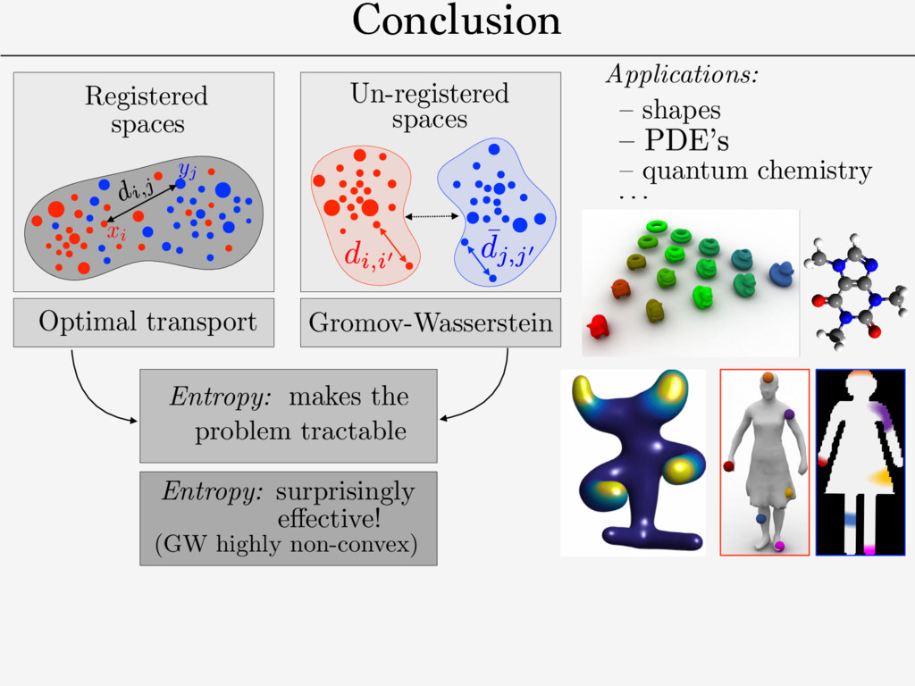 makes the problem tractable e↵ective! Entropy: surprisingly (GW highly non-convex) Applications: – quantum chemistry – shapes Entropic Metric Alignment for Corresponde Justin Solomon∗ MIT Gabriel Peyr´ e CNRS & Univ. Paris-Dauphine Vladimi Adobe R Abstract Many shape and image processing tools rely on computation of cor- respondences between geometric domains. Efficient methods that stably extract “soft” matches in the presence of diverse geometric structures have proven to be valuable for shape retrieval and transfer of labels or semantic information. With these applications in mind, we present an algorithm for probabilistic correspondence that opti- mizes an entropy-regularized Gromov-Wasserstein (GW) objective. Built upon recent developments in numerical optimal transportation, our algorithm is compact, provably convergent, and applicable to any geometric domain expressible as a metric measure matrix. We Source Figure 1: Entropic G surface (left) and a s shared semantic stru ic Metric Alignment for Correspondence Problems n∗ Gabriel Peyr´ e CNRS & Univ. Paris-Dauphine Vladimir G. Kim Adobe Research Suvrit Sra MIT ng tools rely on computation of cor- c domains. Efficient methods that the presence of diverse geometric able for shape retrieval and transfer n. With these applications in mind, babilistic correspondence that opti- omov-Wasserstein (GW) objective. n numerical optimal transportation, ably convergent, and applicable to le as a metric measure matrix. We Source Targets Figure 1: Entropic GW can find correspondences between surface (left) and a surface with similar structure, a surf shared semantic structure, a noisy 3D point cloud, an ico Conclusion