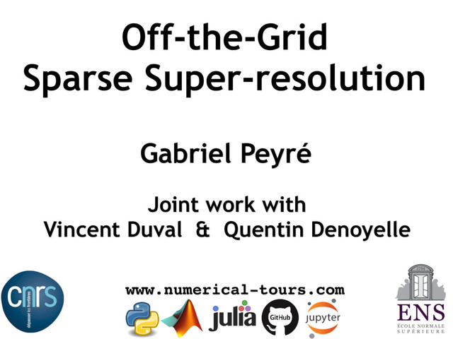 20 t (m1) (m2) x m1 t m2 x [with E. Soubies] N = 1 N = 3 ⌘W ⌘W ¯ x = 2 ¯ x = 20 Non-translation-invariant operator ¯ x x1 x2 ! ⌘W depends on ¯ x! Proposition: In particular, ⌘W is non-degenerate. ⌘W (x) = 1 ✓ x ¯ x x + ¯ x ◆2N (m) def. = Z '(x)dm(x) '(x) = e x· '(x) Total internal reflection fluorescence microscopy (TIRFM) [Boulanger et al. 2014] varying the azimuth φ during the exposure time and can be modeled by the following expression: gðθÞ = Z2π 0 Z∞ 0 Z∞ −∞ Iðz; α; φÞρ θ − α Ω=cos θ f À z Á dαdzdφ; where fðzÞ is the density of fluorophores in the medium con- volved by the emission point spread function and ρð · Þ represents slope of the glass slide recovered (Fig. 2D), the latter falling within the confidence interval deducted from the accuracy of the mea- surement of the different characteristic dimensions of the sample. Finally, from the dispersion of the estimated depth around the average slope (Fig. 2D), we can conclude that the localization precision obtained with this approach is higher than the corre- sponding precision given by estimating the location of the beads in the WF image stack as already mentioned (17). Estimating the 3D density of fluorophores convolved by the emission point spread function then would simply boil down to inverting the linear system. Some care has to be taken when inverting such system, as the inverse problem is at best badly con- ditioned. Nevertheless, constraints can be imposed to the solution such as positivity, and, in the case of time-lapse acquisitions, a multiframe regularization can be used in addition to the spatial and temporal regularization smoothness to solve the reconstruction problem. Moreover, to be effective, such a positivity constraint requires a correct knowledge of the background level. As a conse- quence, for each multiangle image stack, a background image is obtained by driving the beam out of the objective. Given that several convex constraints have to be satisfied at the same time, we propose to rely on a flavor of the PPXA algorithm (26) to estimate the tridimensional density of fluorophores (Fig. S4). More detailed information on how noise, object depth, and the required number of angles can be taken into account is discussed in SI Imaging Model and Reconstruction and Fig. S5. Finally, to take into account the variations of the medium index, we select an effective index within a predefined range by minimizing the reconstruction error at each pixel under a spatial smoothness constraint (Fig. S6). It is worth noting that the computation time for the reconstruction on 10 planes from a stack 512 × 512 images corresponding to 21 in- cidence angles ranges from 1 to 5 min depending on the number of iterations. Imaging in Vitro and in Vivo Actin Assembly. The proposed multi- angle TIRF image reconstruction approach was then tested on complex samples such as actin network architectures for which spatial resolution and dynamics remain an issue. We first chal- lenged the spatial organization of actin nucleation geometry A B C D Fig. 2. Experimental validation of the multiangle TIRF model. (A) Schema of the system designed to create a slope of fluorescent beads. (B) Overlay of the maximum intensity projection of image stack acquired with WF and TIRF illumination. (Scale bar: 5 μm.) The evolution of the intensity versus the illumination angle θ of two selected beads are plotted in C with the corre- sponding fitting theoretical model (continuous line) for their estimated depth (respectively 10 and 89 nm). (D) Depth of all of the beads estimated by fitting the theoretical TIRF model (in red) and the depth of the same beads estimated by fitting a Gaussian model in the WF image stack (in green). BIOPHYSICS AND COMPUTATIONAL BIOLOGY slope of the glass slide recovered (Fig. 2D), the latter falling within the confidence interval deducted from the accuracy of the mea- surement of the different characteristic dimensions of the sample. Finally, from the dispersion of the estimated depth around the average slope (Fig. 2D), we can conclude that the localization precision obtained with this approach is higher than the corre- sponding precision given by estimating the location of the beads in the WF image stack as already mentioned (17). Estimating the 3D density of fluorophores convolved by the emission point spread function then would simply boil down to inverting the linear system. Some care has to be taken when inverting such system, as the inverse problem is at best badly con- ditioned. Nevertheless, constraints can be imposed to the solution such as positivity, and, in the case of time-lapse acquisitions, a multiframe regularization can be used in addition to the spatial and temporal regularization smoothness to solve the reconstruction problem. Moreover, to be effective, such a positivity constraint requires a correct knowledge of the background level. As a conse- quence, for each multiangle image stack, a background image is obtained by driving the beam out of the objective. Given that several convex constraints have to be satisfied at the same time, we C D perimental validation of the multiangle TIRF model. (A) Schema em designed to create a slope of fluorescent beads. (B) Overlay mum intensity projection of image stack acquired with WF and ✓(t) y(t) ! multiple angles ✓(t). light depth x cell y(t) = m(t) ✓(t)