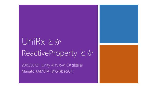 // Presenter public class UpDownPresenter : MonoBehaviour { // View public Button UpButton; public Button DownButton; public Text ScoreText; // Model [InspectorDisplay] public IntReactiveProperty Score; private void Start() { this.UpButton.OnClickAsObservable().Subscribe(_ => this.Score.Value++); this.DownButton.OnClickAsObservable().Subscribe(_ => this.Score.Value--); this.Score.SubscribeToText(this.ScoreText); } } Passive View Presenter (Supervising Controller) Model updates view state-change events user events update model Model が state-change event を配信 (ReactiveProperty<int> のイベント ストリーム)