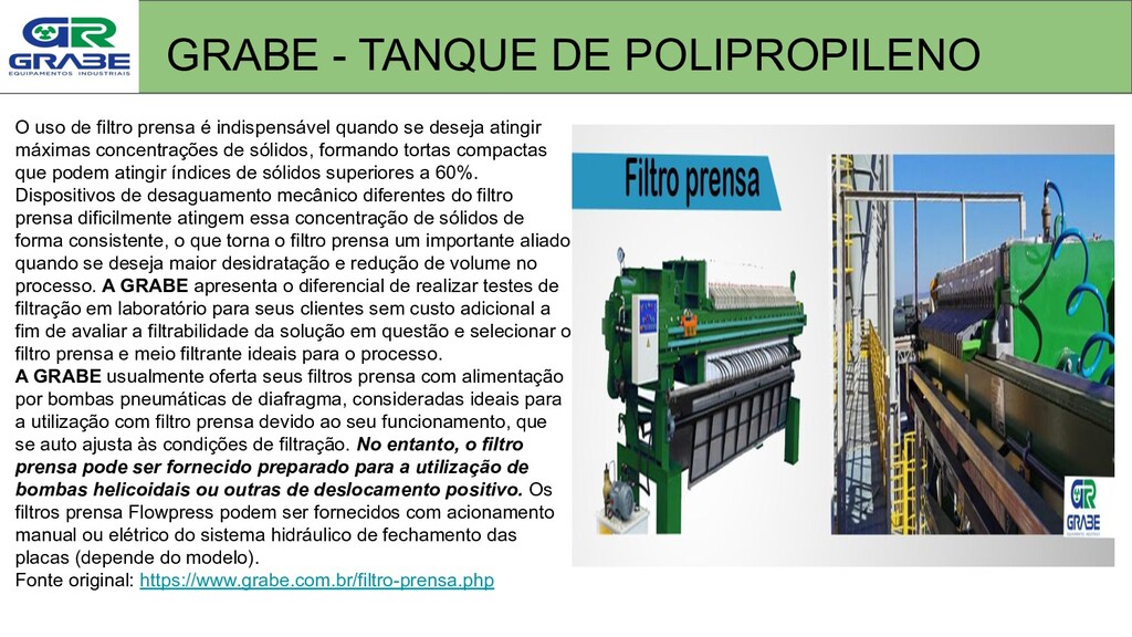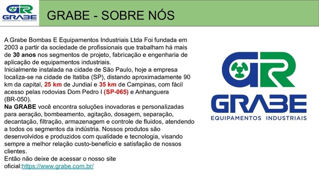 A Grabe Bombas E Equipamentos Industriais Ltda Foi fundada em 2003 a partir da sociedade de profissionais que trabalham há mais de 30 anos nos segmentos de projeto, fabricação e engenharia de aplicação de equipamentos industriais.