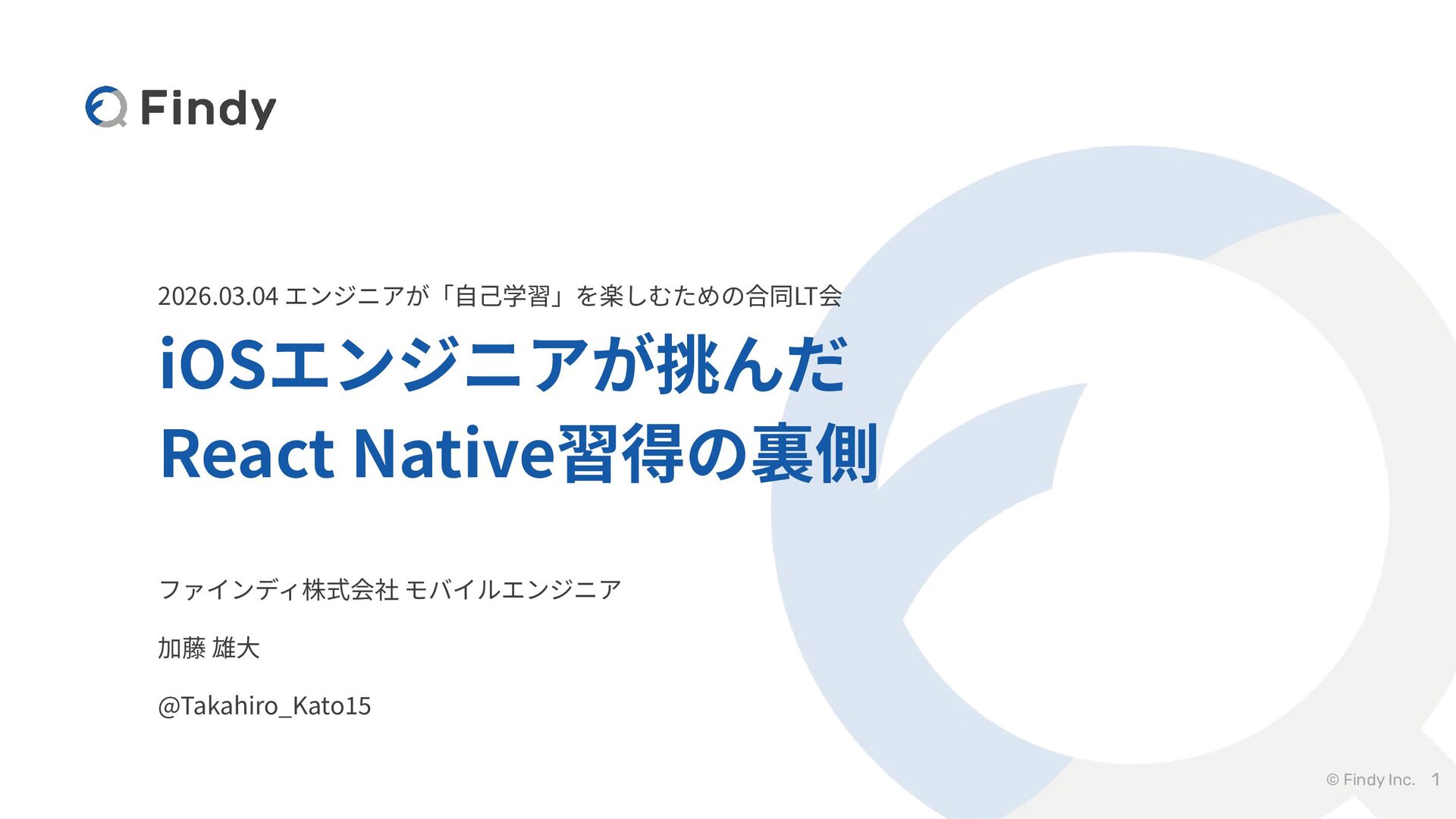 © Findy Inc. 2026.03.04 エンジニアが「⾃⼰学習」を楽しむための合同LT会 iOSエンジニアが挑んだ React Native習得の裏側 1 ファインディ株式会社