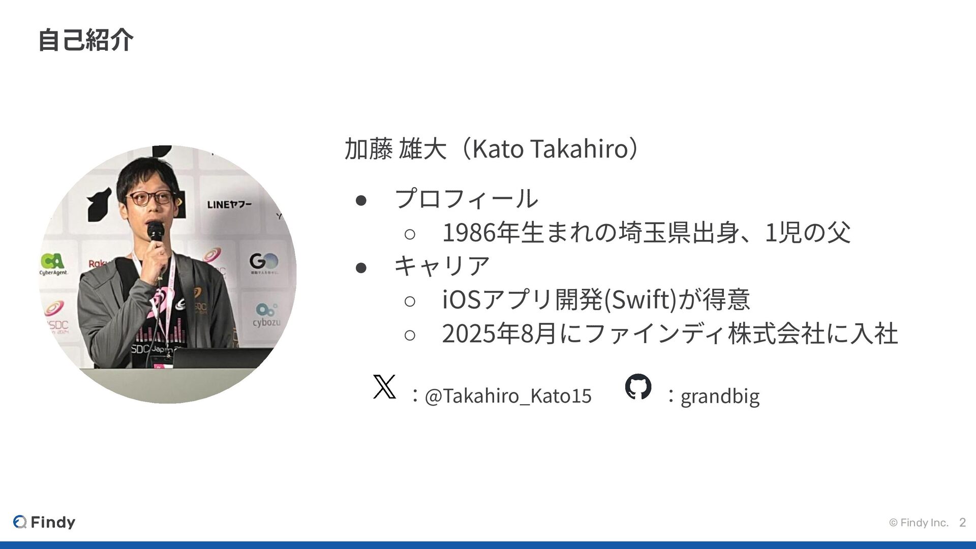 ◦ 1986年⽣まれの埼⽟県出⾝、1児の⽗ • キャリア ◦ iOSアプリ開発(Swift)が得意 ◦ 2025年8⽉にファインディ株式会社に⼊社 :@Takahiro_Kato15 :grandbig