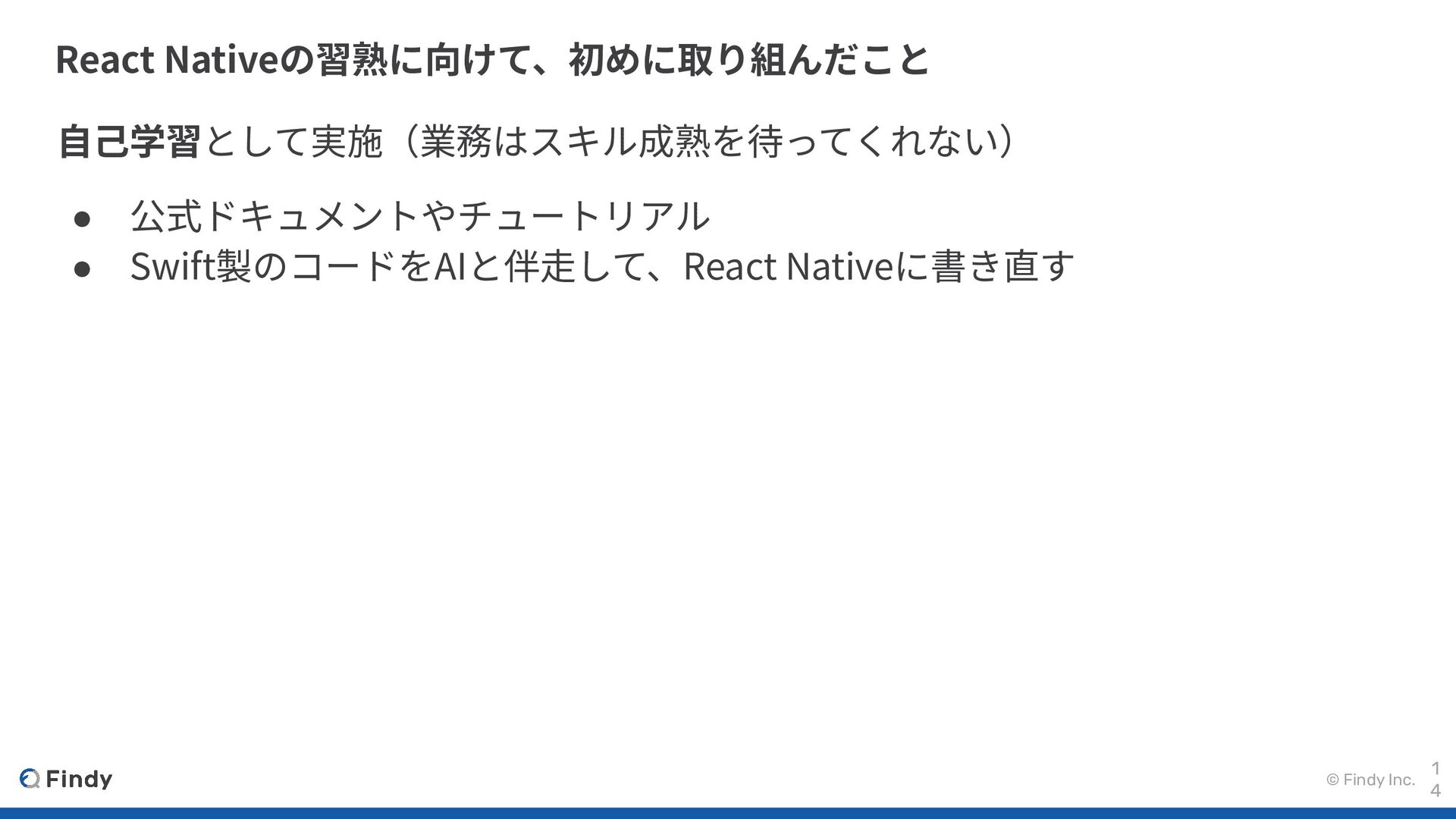 © Findy Inc. 1 4 React Nativeの習熟に向けて、初めに取り組んだこと ⾃⼰学習として実施(業務はスキル成熟を待ってくれない) • 公式ドキュメントやチュートリアル