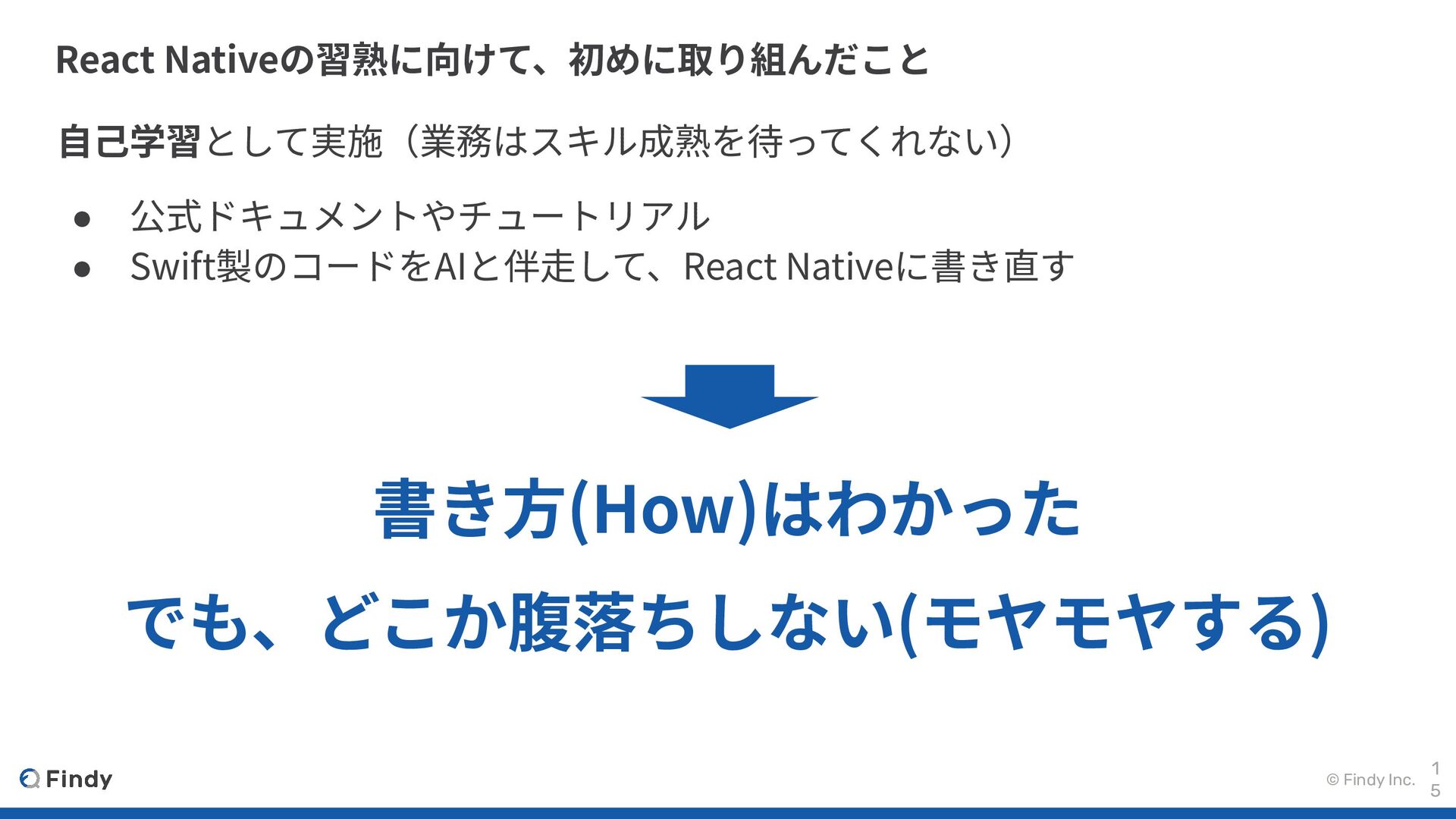 © Findy Inc. 1 5 React Nativeの習熟に向けて、初めに取り組んだこと ⾃⼰学習として実施(業務はスキル成熟を待ってくれない) • 公式ドキュメントやチュートリアル