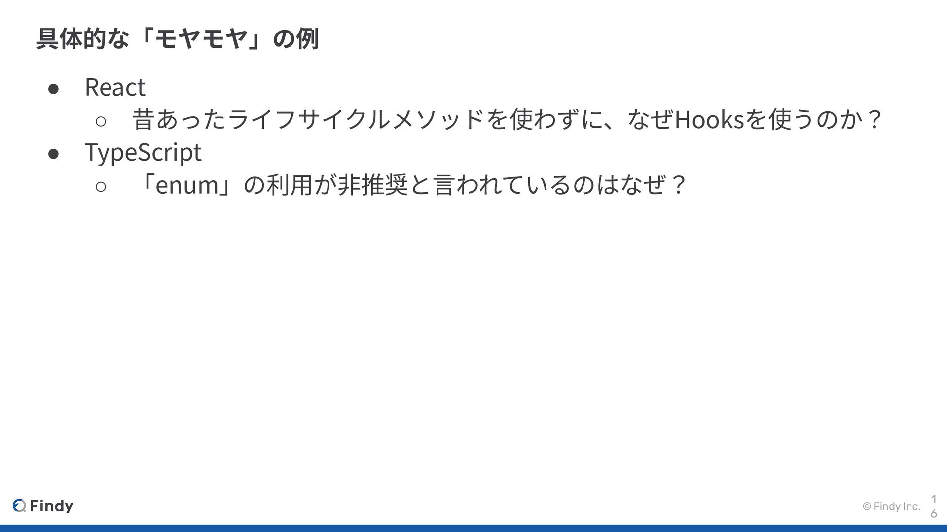 © Findy Inc. 1 具体的な「モヤモヤ」の例 • React ◦ 昔あったライフサイクルメソッドを使わずに、なぜHooksを使うのか? •