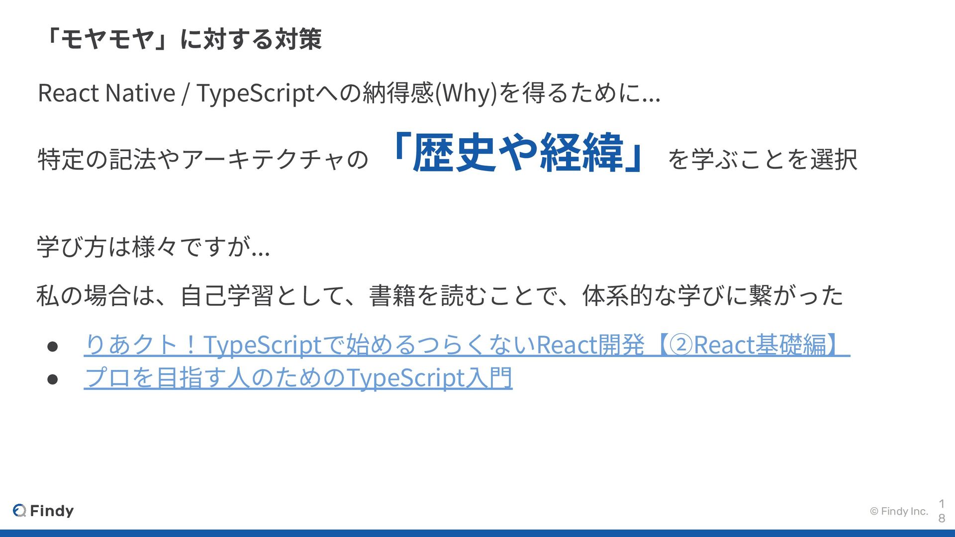 © Findy Inc. 1 8 「モヤモヤ」に対する対策 React Native / TypeScriptへの納得感(Why)を得るために...