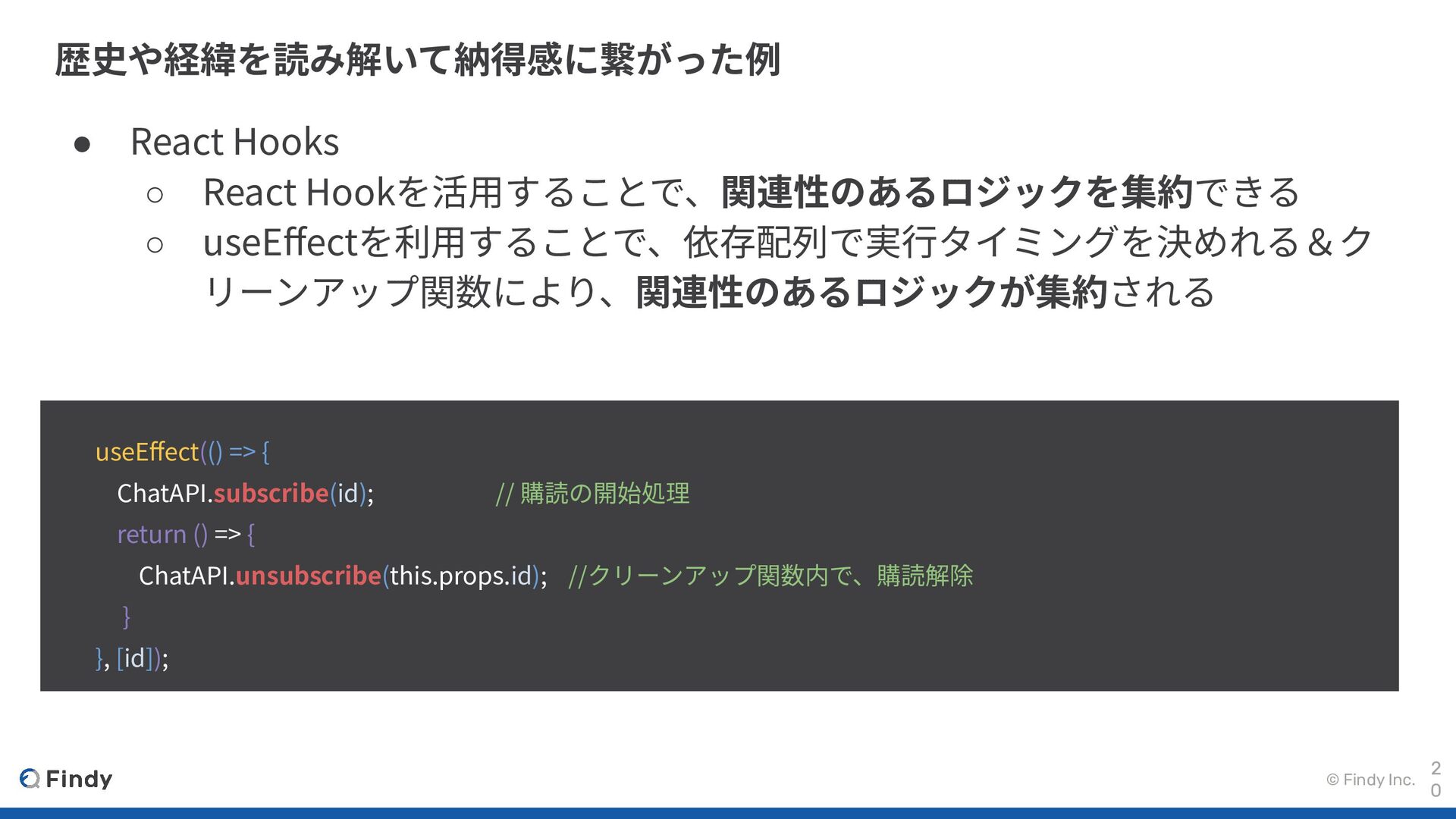 © Findy Inc. 2 0 歴史や経緯を読み解いて納得感に繋がった例 • React Hooks ◦